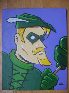 “First, we have a Green Arrow painting by the talented Lin Workman. I had the good fortune to see this delightful caricature at the Superman Celebration in Metropolis this year, and it’s simply gorgeous, a must for any GA fan.”