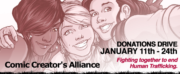 Monday, January 11th is National Human Trafficking Awareness Day. To participate, we formed the Comic Creator’s Alliance–a group of over eighty comic book creators (both web and print) who volunteered our artistic talents to raise money and awareness for this cause. You may not know it, but there are currently 27 million enslaved people worldwide– more than double the number of enslaved Africans during the trans-Atlantic slave trade. UNICEF estimates that 1.2 million children every year are sold into slavery, most of it sexual. The US Department of Justice estimates 16,000 victims of human trafficking are brought into the United States every year. Unlike slavery in the 19th century, what is happening today is happening in secret. So it won’t end until awareness is raised, and people like you and me take a stand.