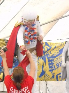Some of the audience were great at playing along- like Karla when I handed out the capes/scarves and leis.