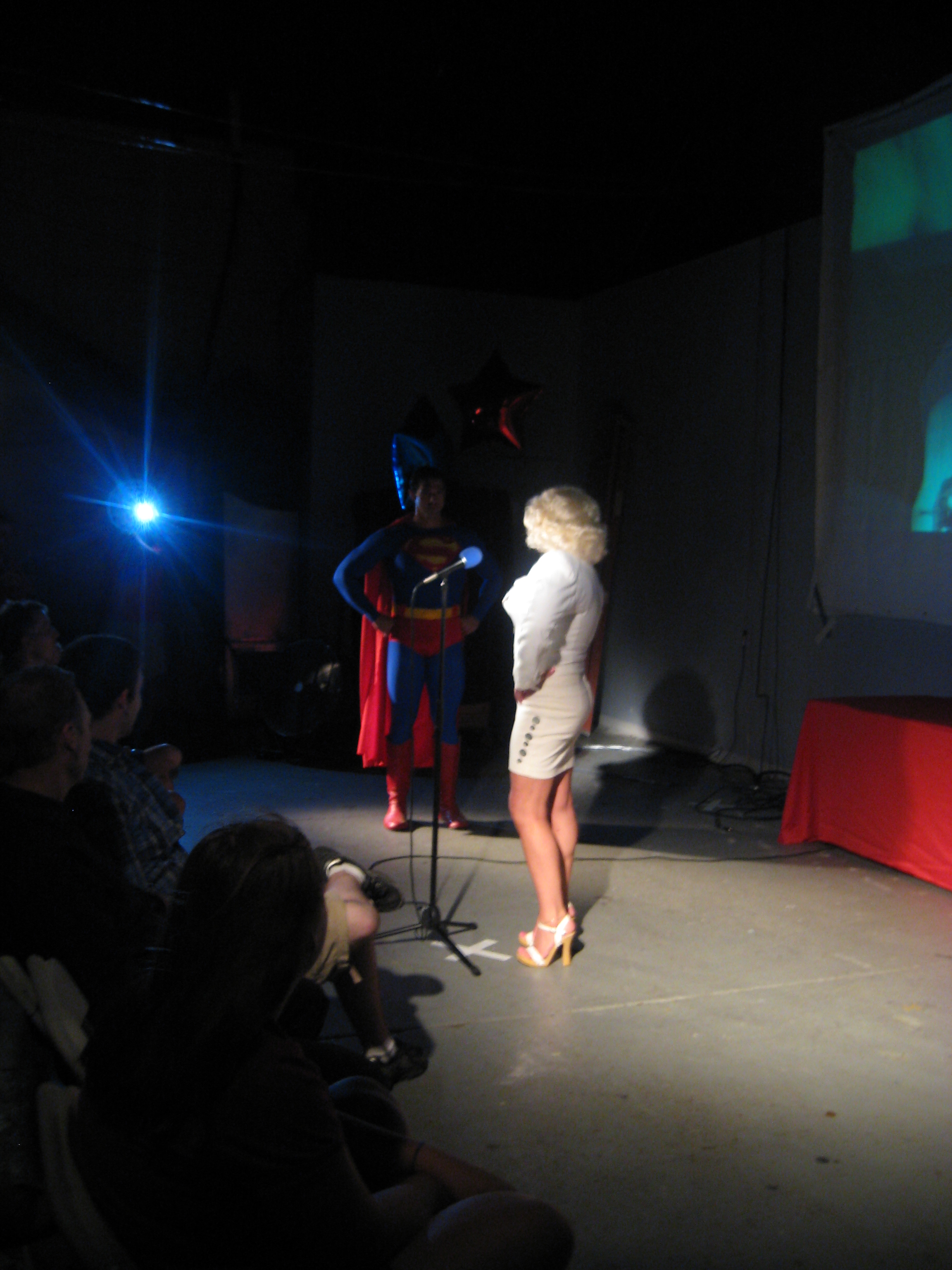 We continued with movie night on Saturday with Superman and the Mole-Men, with special guest actress and emcee Beverly Washburn (and some mole-men). It was preceded by a George Reeves tribute video by Tim Brown. We also showed more fan films on Saturday night. Two of the fan film winners were there which was great. Once the movie and fan films were over we cleared out the chairs and tried something new in Metropolis…