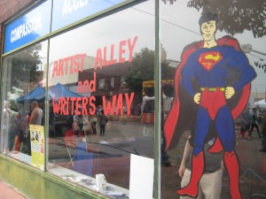 It was slow and Steve (later to be know as “Cake”- but that’s another story!) was concerned we might be missing art sales, but the building had great A/C. I’d seen what the heat outside could do to a better man! It also had a full kitchen, two restrooms, and a stage. I was happy and comfortable. I told him that once folks found out about our set up and the A/C they’d find us- especially the folks in costumes and ones not accustomed to the Metropolis summer heat. For once I was right! Word got out and we were seeing more and more people and families visit our space.