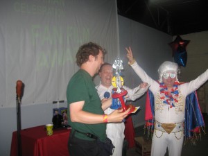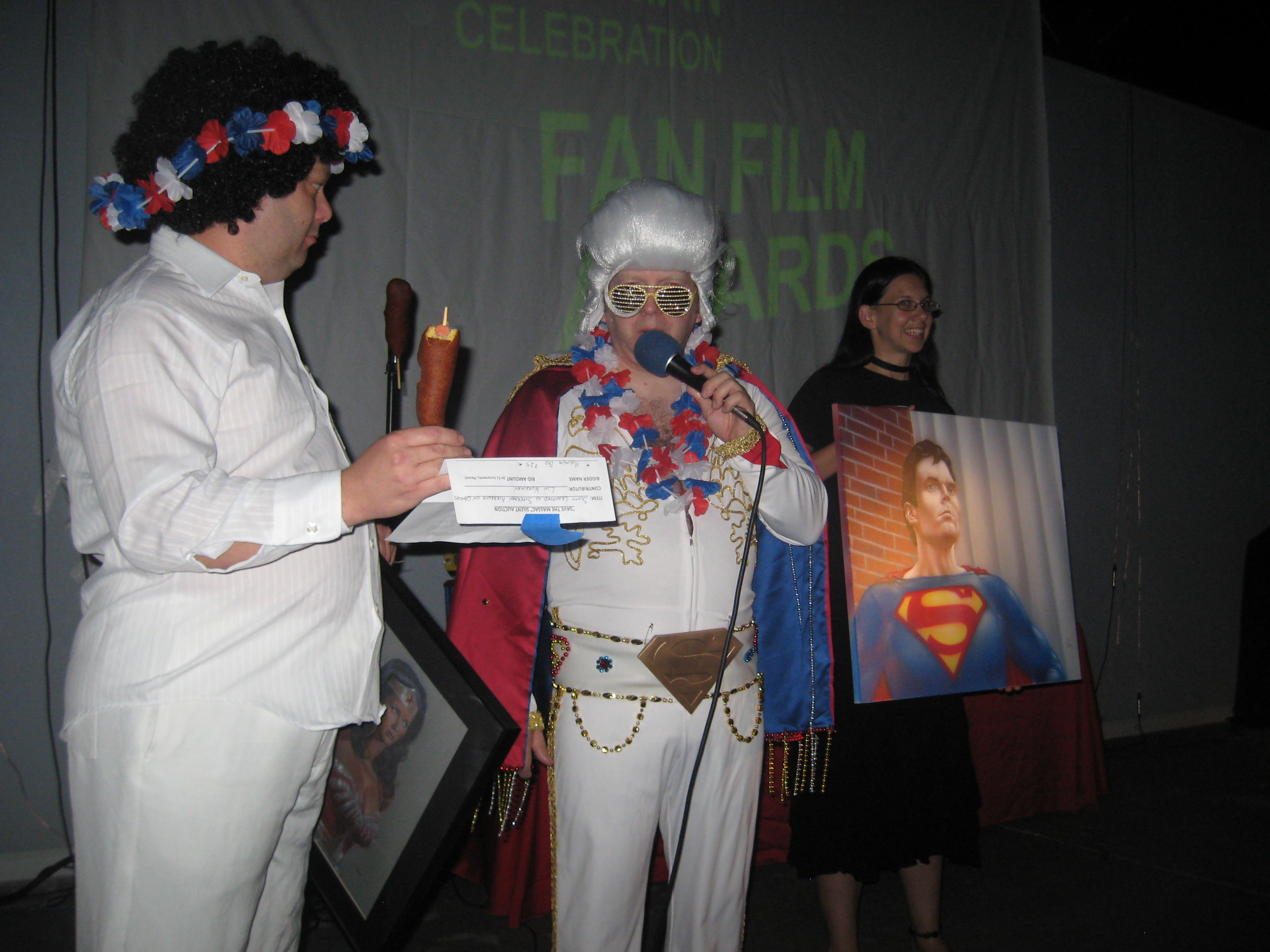 One of the “Memphis Mafia”- Tim Brown, had an idea to add fan films to the mix. We showed the Super-Muley short we made, another fan film with Scott Cranford in it, and many others including Batman: Dead End which was given to us at Midsouthcon by our friend and stuntman/SPFX artist Dragon Dronet. Inbetween fims Kevin, Muley, and Stephanie Perrin gave out door prizes. The next year we called for fan film submissions and Tim created the Superman Celebration Fan Film awards. We just had the 5th annual awards this year!