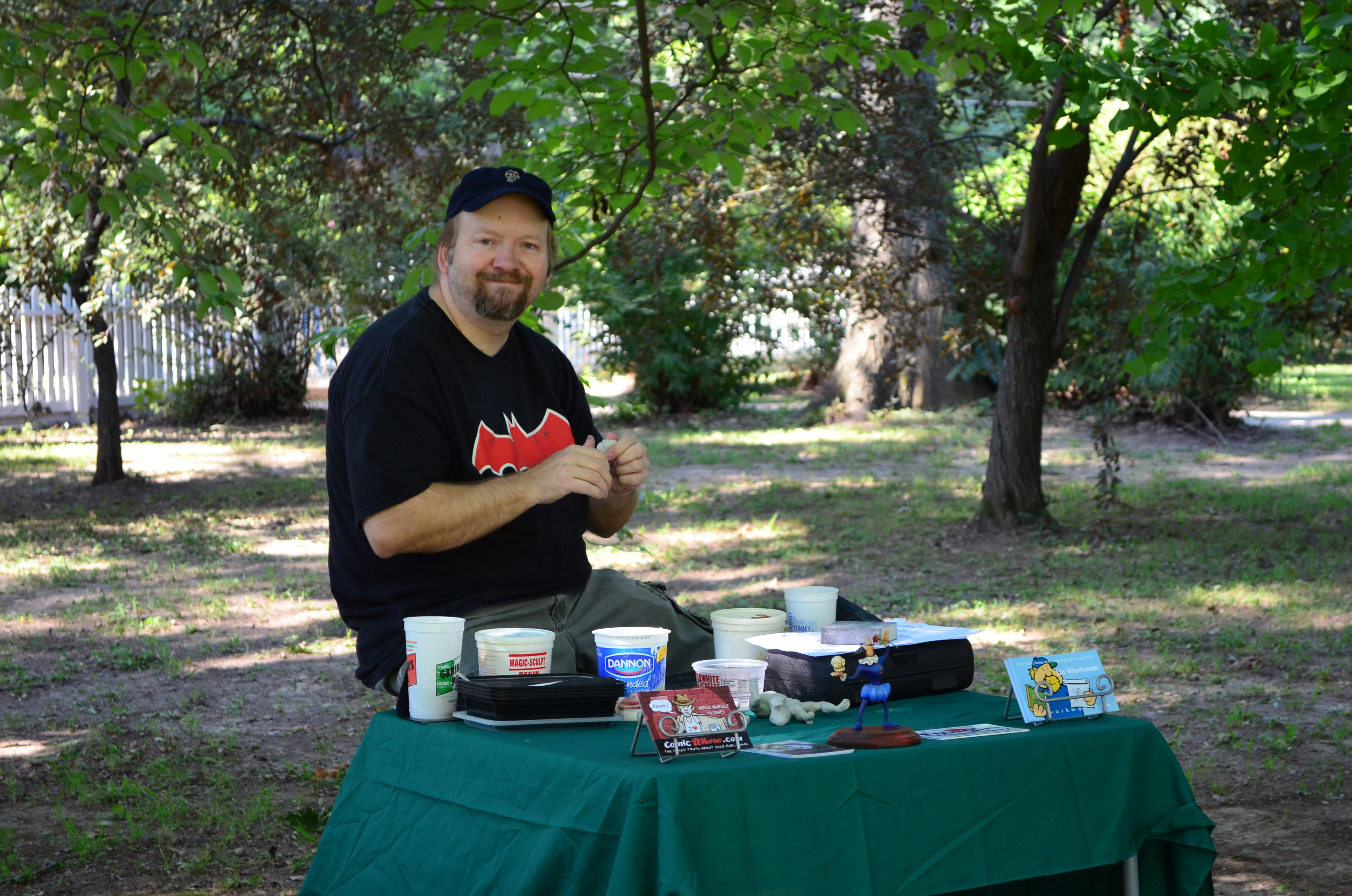 I set set up a table out in the front yard under a shade tree to do a sculpting demo. I took our wedding topper and a Superman sculpt for Metropolis’s next art show to work on while I was there. Had a good time sculpting and talking to folks. Even saw some old friends. Lots of other artists were set up too doing pottery, jewelry, glass blowing, portraits, weaving, and wood carving. The gift shop in the gallery was open, too. I had a few folks say they saw my comics and sketchbooks in there. Nicki had a lot of subjects to shoot with her new toy and wandered around exploring the grounds and checking out the art gallery inside. A bit later she walked down the street to the Farmers Market on Court Square. She’s gotten really good in a very short time. I’m proud of my shutterbug. Was also happy she brought me back a strawberry shake from “The Dip“!