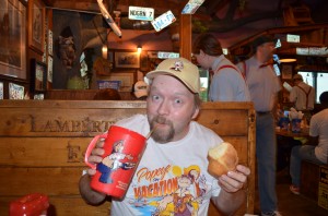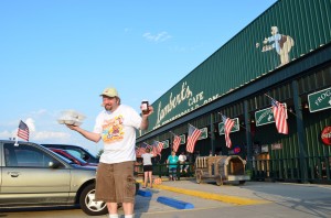 We did get to stop by Lambert’s Cafe f0r dinner on the way back home. Had some sweet tea, roast beef, mashed potatoes and gravy, corn, baby carrots, a couple servings of “pass-arounds“, and a couple throwed rolls. Had to put most of it in a box to go, and picked up a jar of apple-butter in the gift shop on the way out. That stuff rocks!