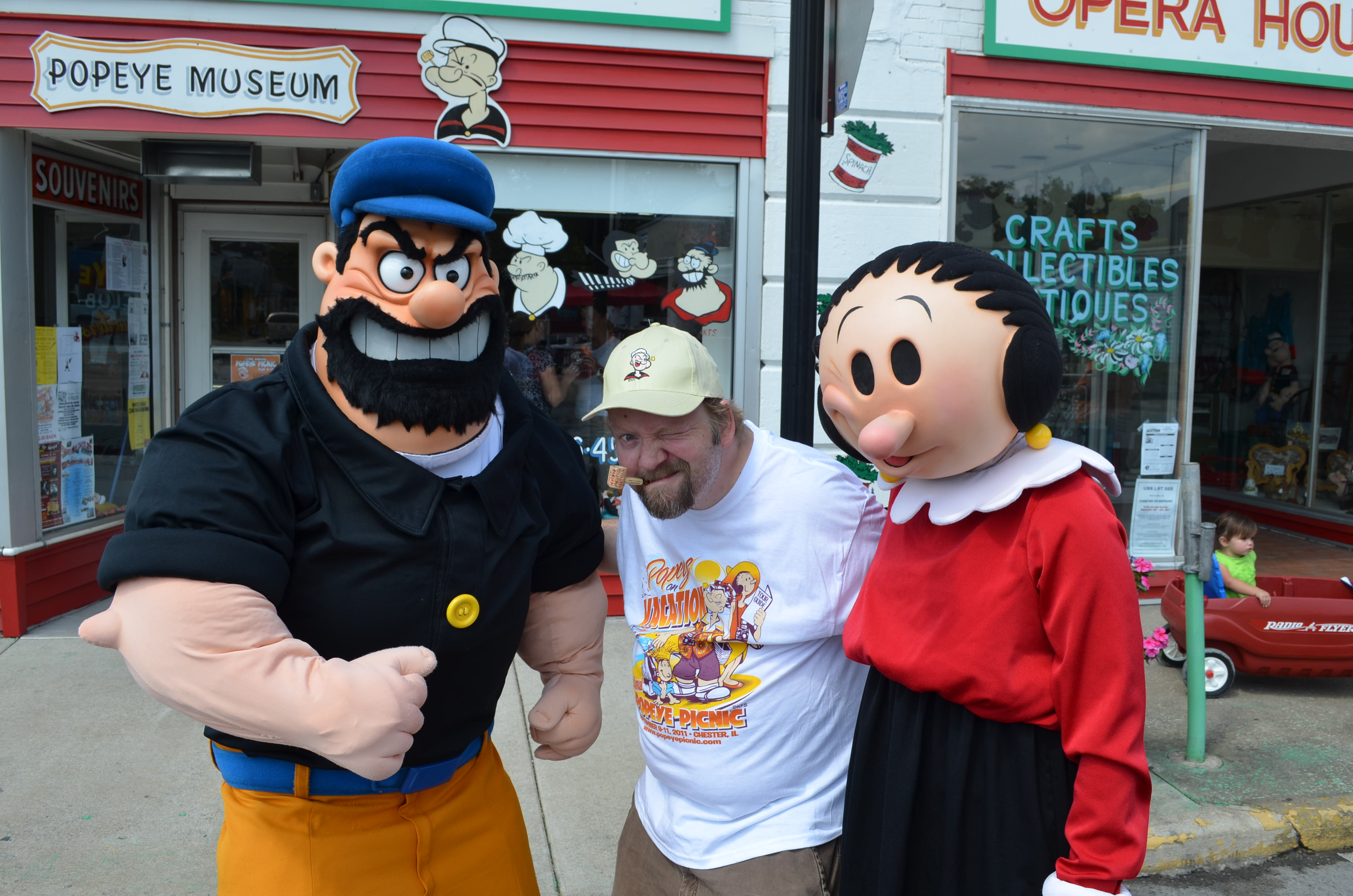 I was going to go to the Popeye Picnic in Chester, IL on Saturday, but postponed it until Sunday. Kevin Williams had to cancel, but Tim Brown and I headed out first thing in the morning and had a blast. It was about a 3hr drive, but very easy to find. If we could have gone up the Mississippi River it would have been a straight shot. Like Memphis, it’s a river town.