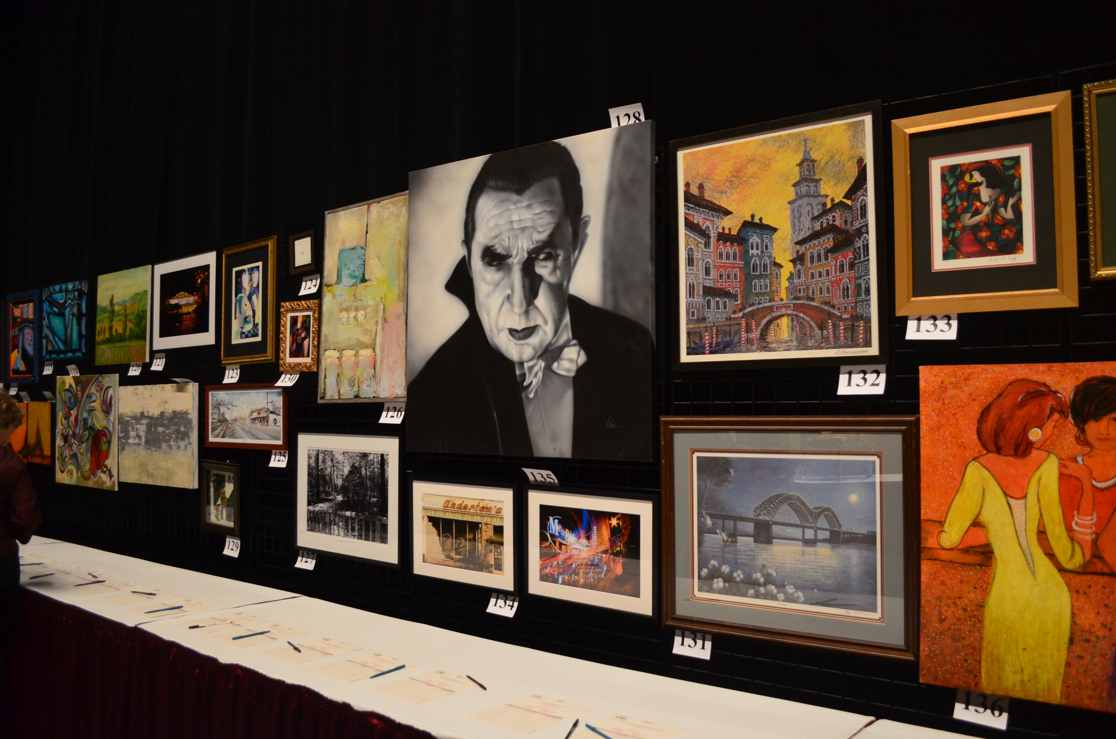 Behind the large stage backdrop was the art area and some of the other silent auction items. There was my Dracula painting in the middle of the the others. It was hard to miss- he is 4’x4′!