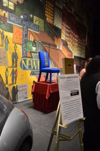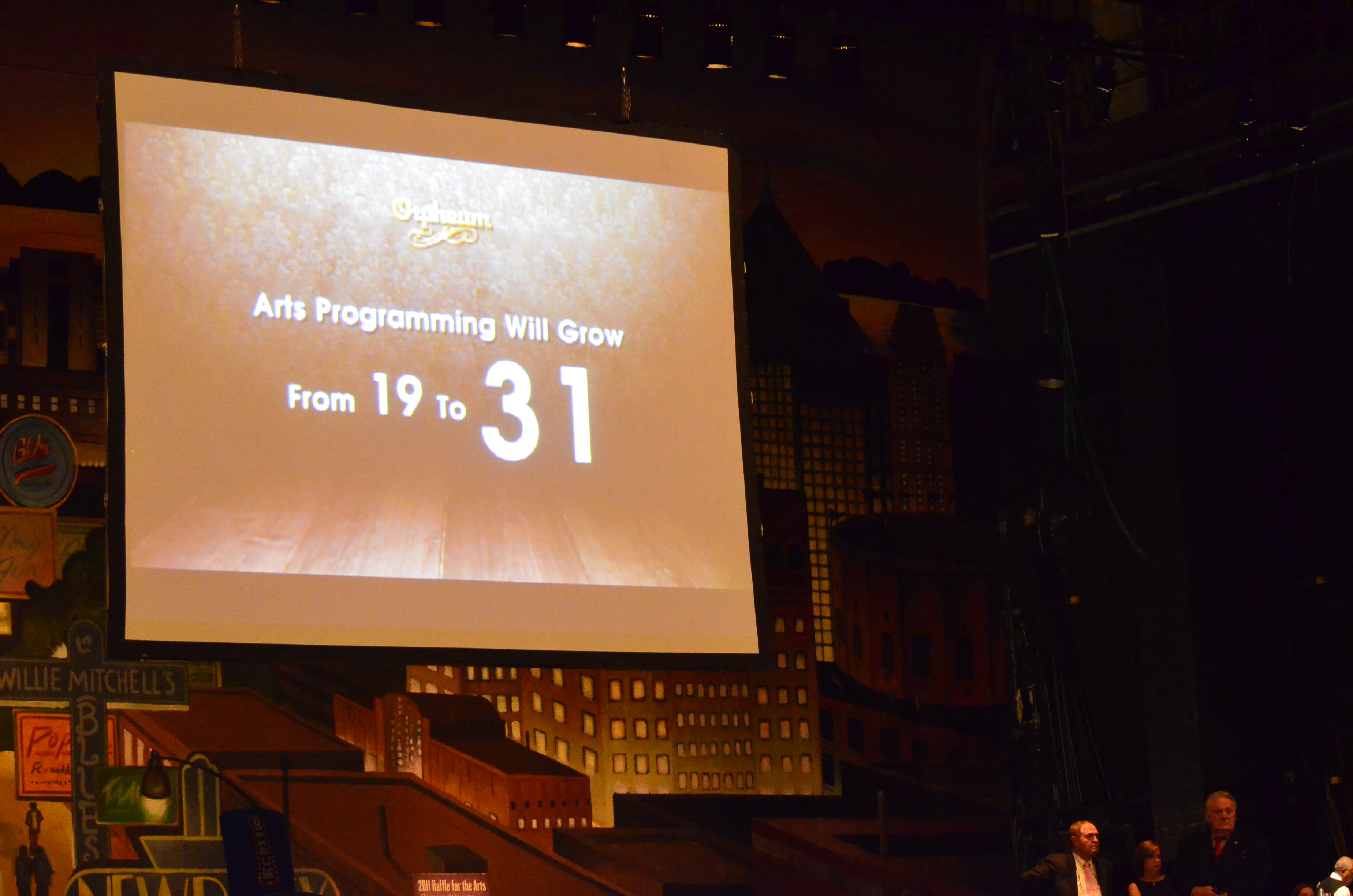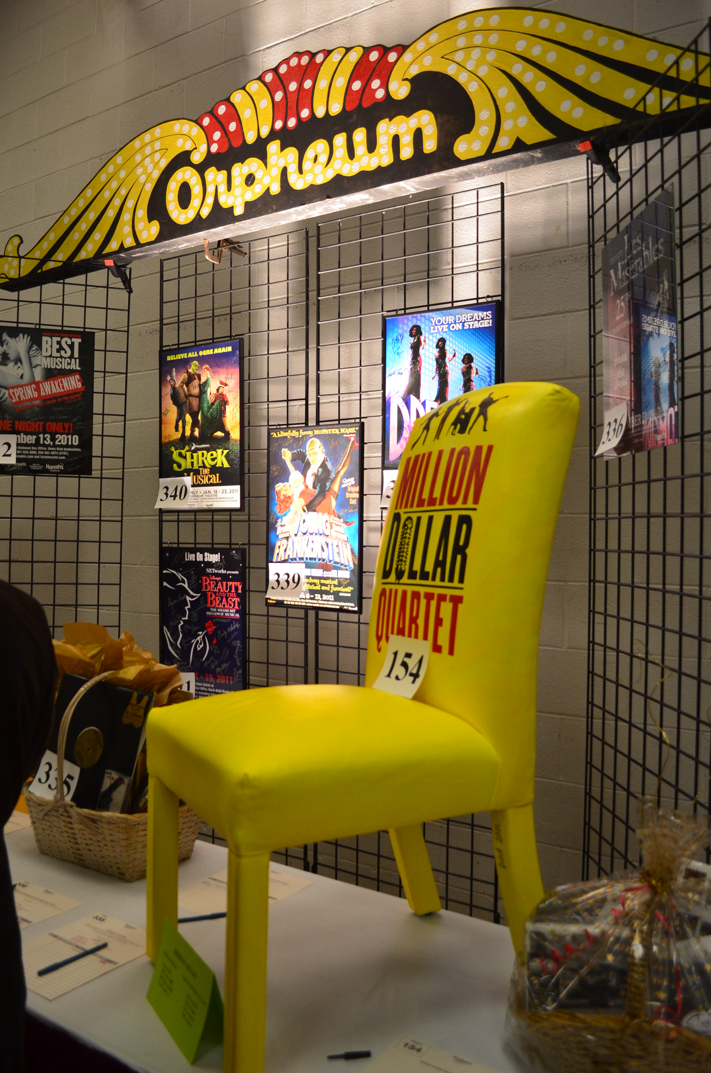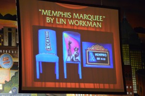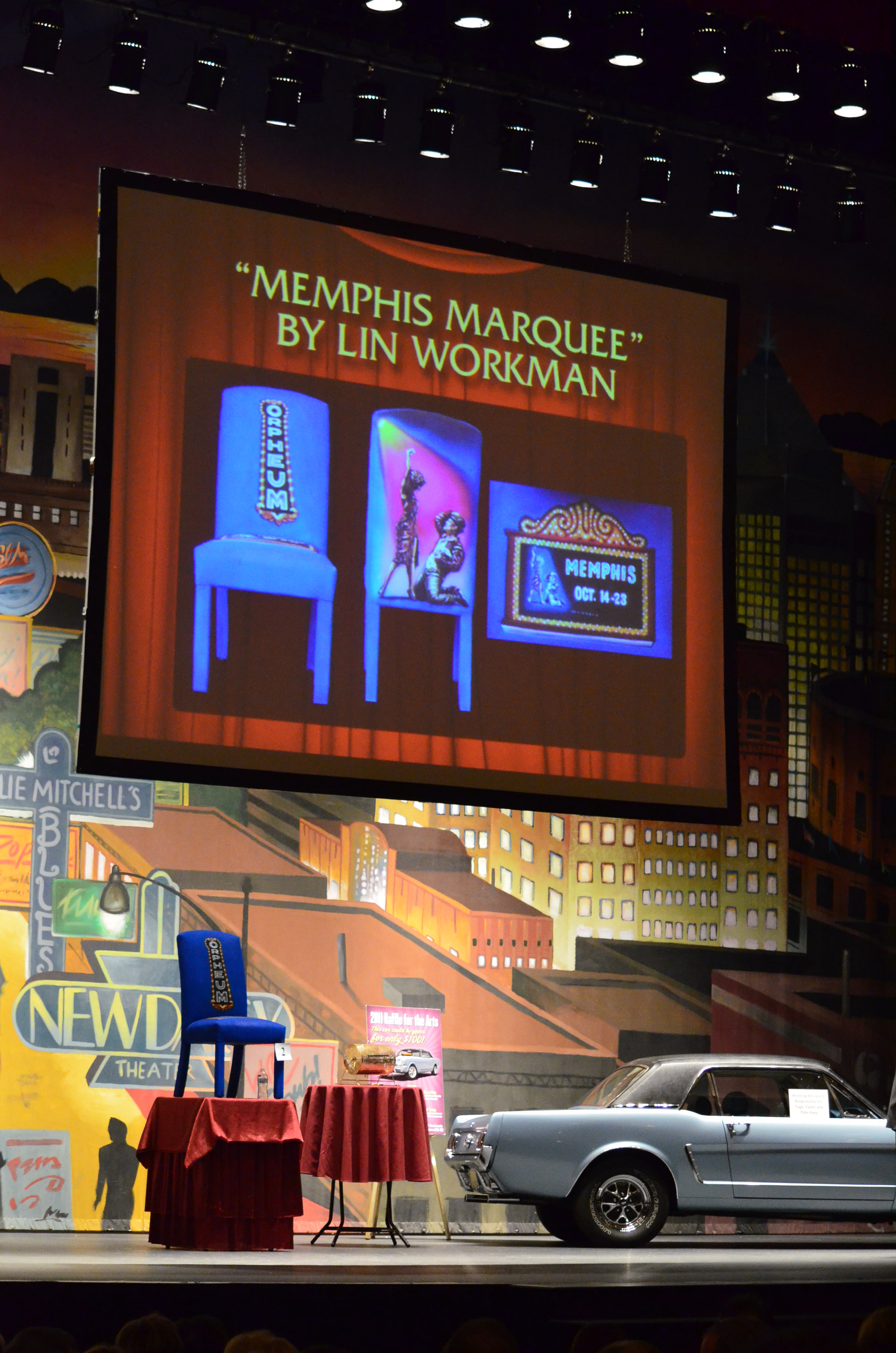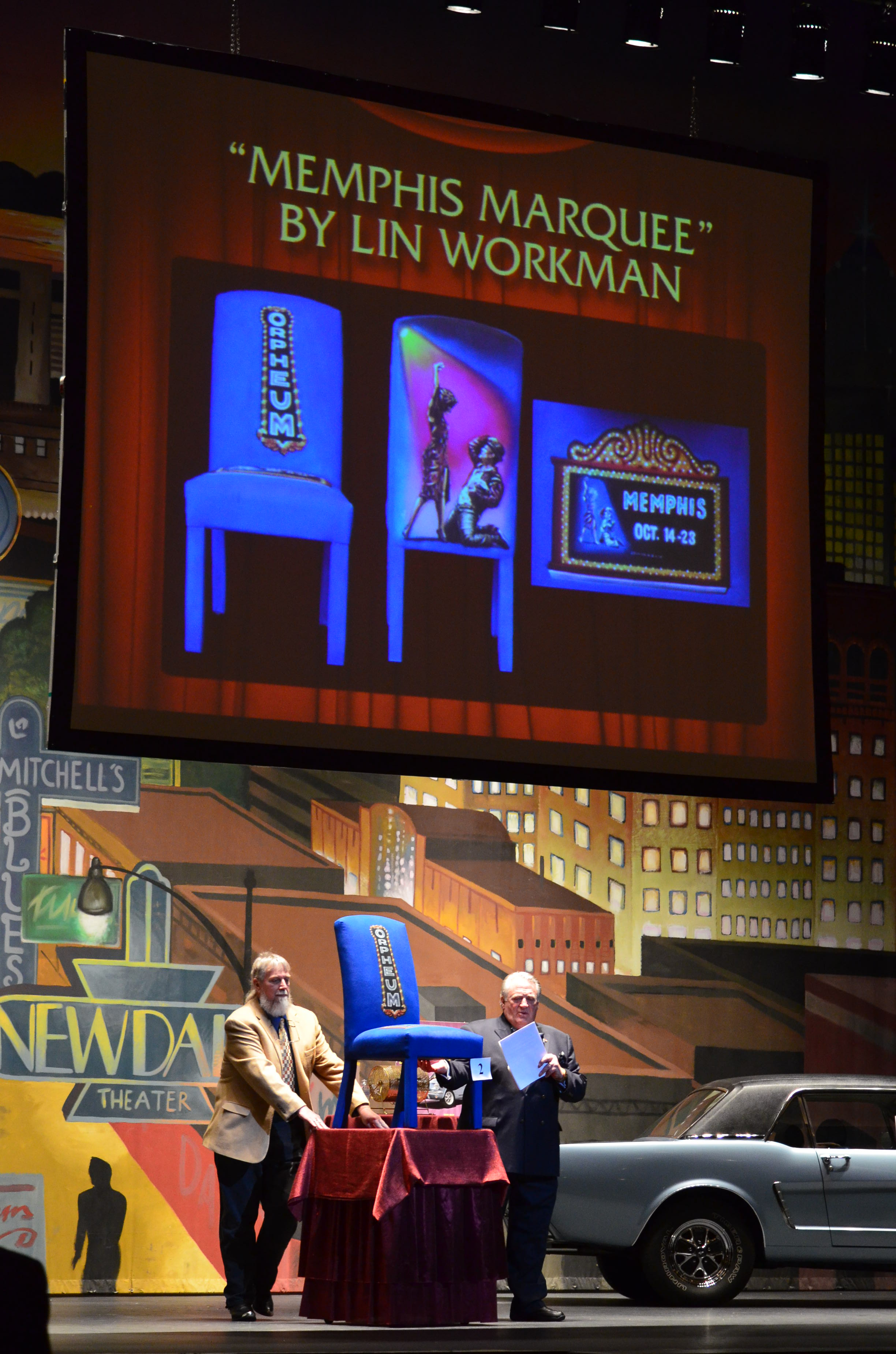 They turned it 360 degrees revealing the back art to the audience as the bidding started, and even tilted it forward for folks to see the seat marquee art. The marquee had the MEMPHIS logo, two main figures from the show (and back of the chair), and the dates it played at the Orpheum. There were photos and my name projected on a large screen hanging above the stage. Each item in the live auction were projected up when their turn came up.