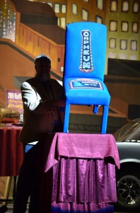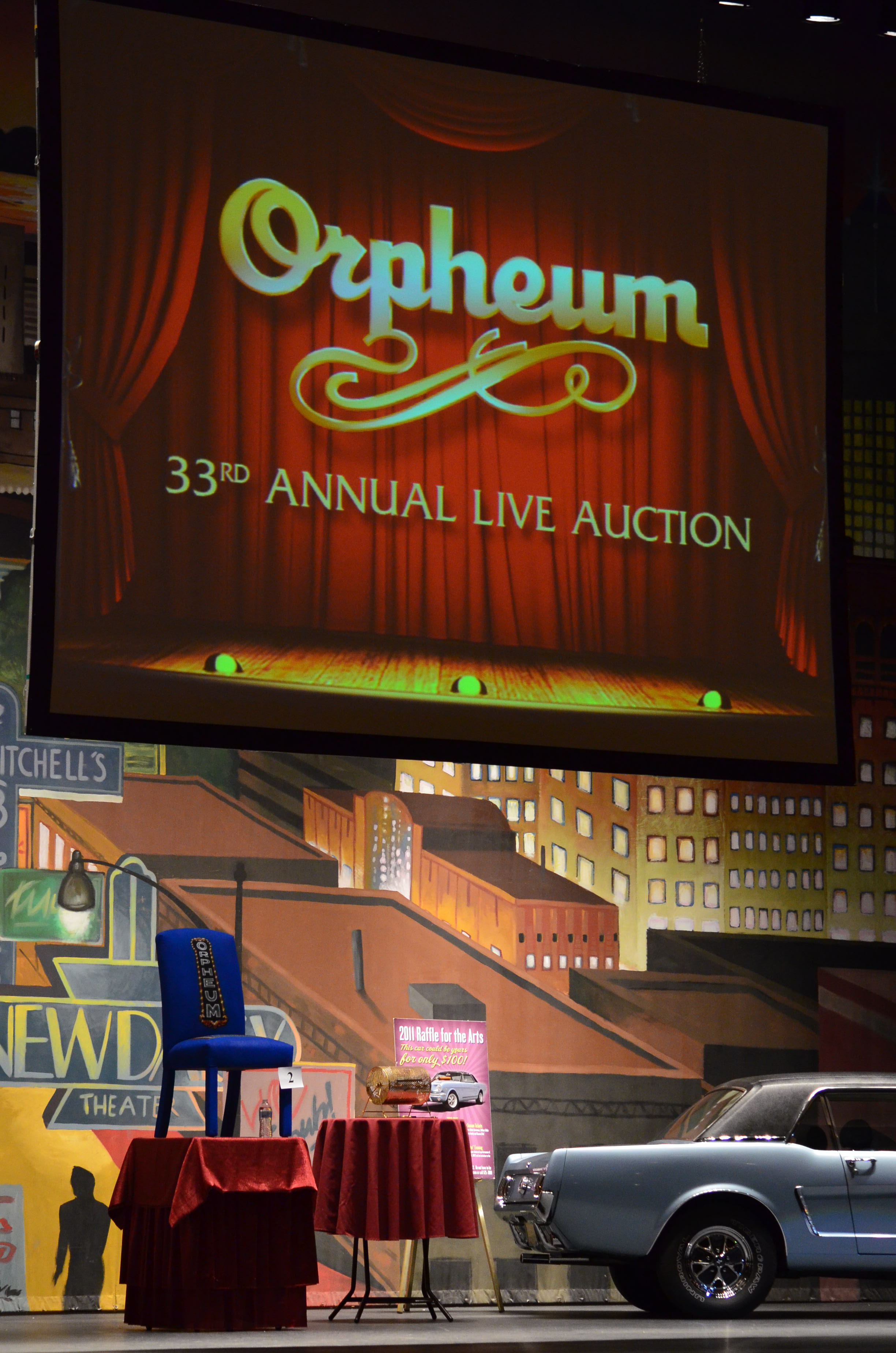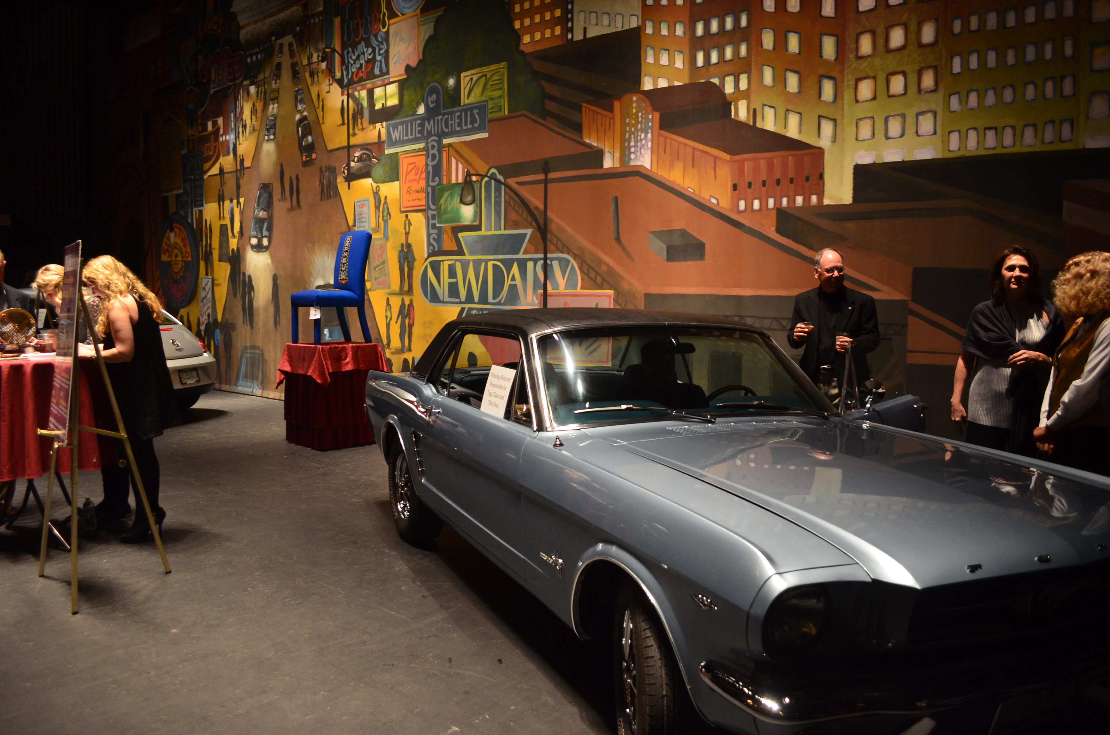 Lynn and Rhonda had told us my chair was sitting center stage when we first got there- and I geeked a bit when hearing that, but seeing it for myself as one of THE auction items on stage (Between a new VW Beetle up for auction and a classic ’65 Mustang that was being raffled off) I really geeked! I don’t think I’ve ever had any of my art in such a prominent place or with that much lighting. I get people offering to get me “exposure” for my art, but in Memphis- at least for me, it doesn’t get much better than being onstage at The Orpheum!