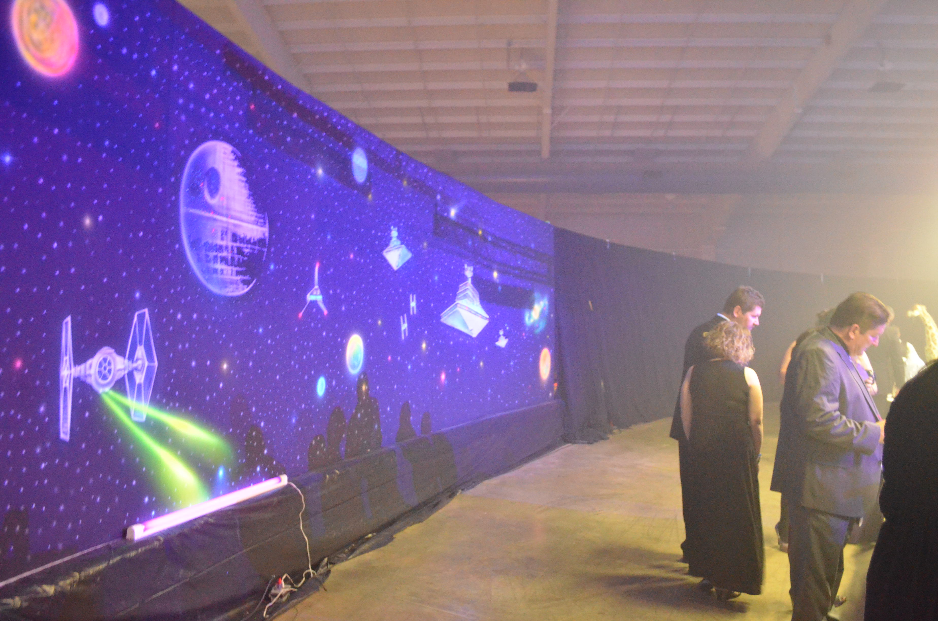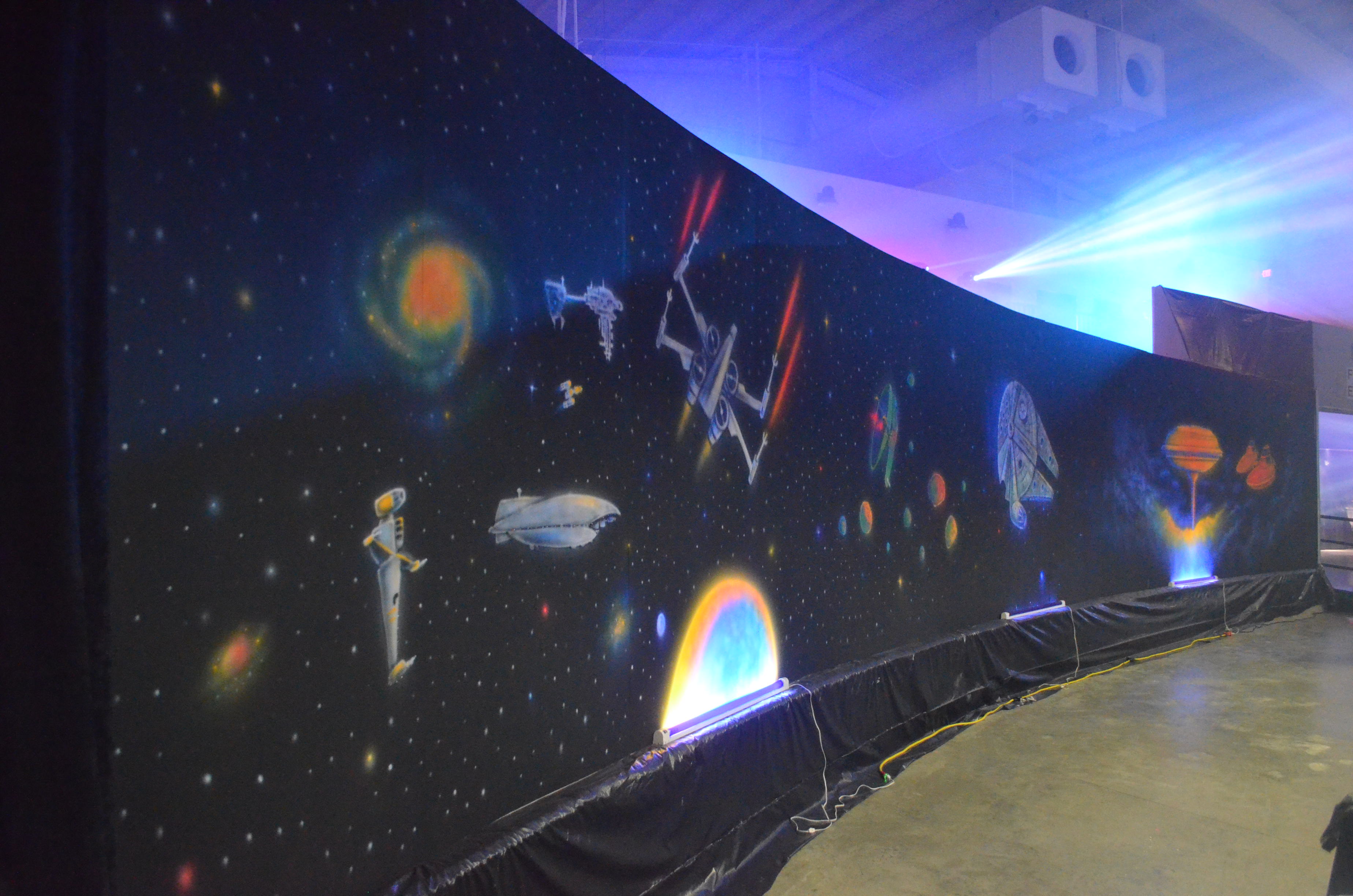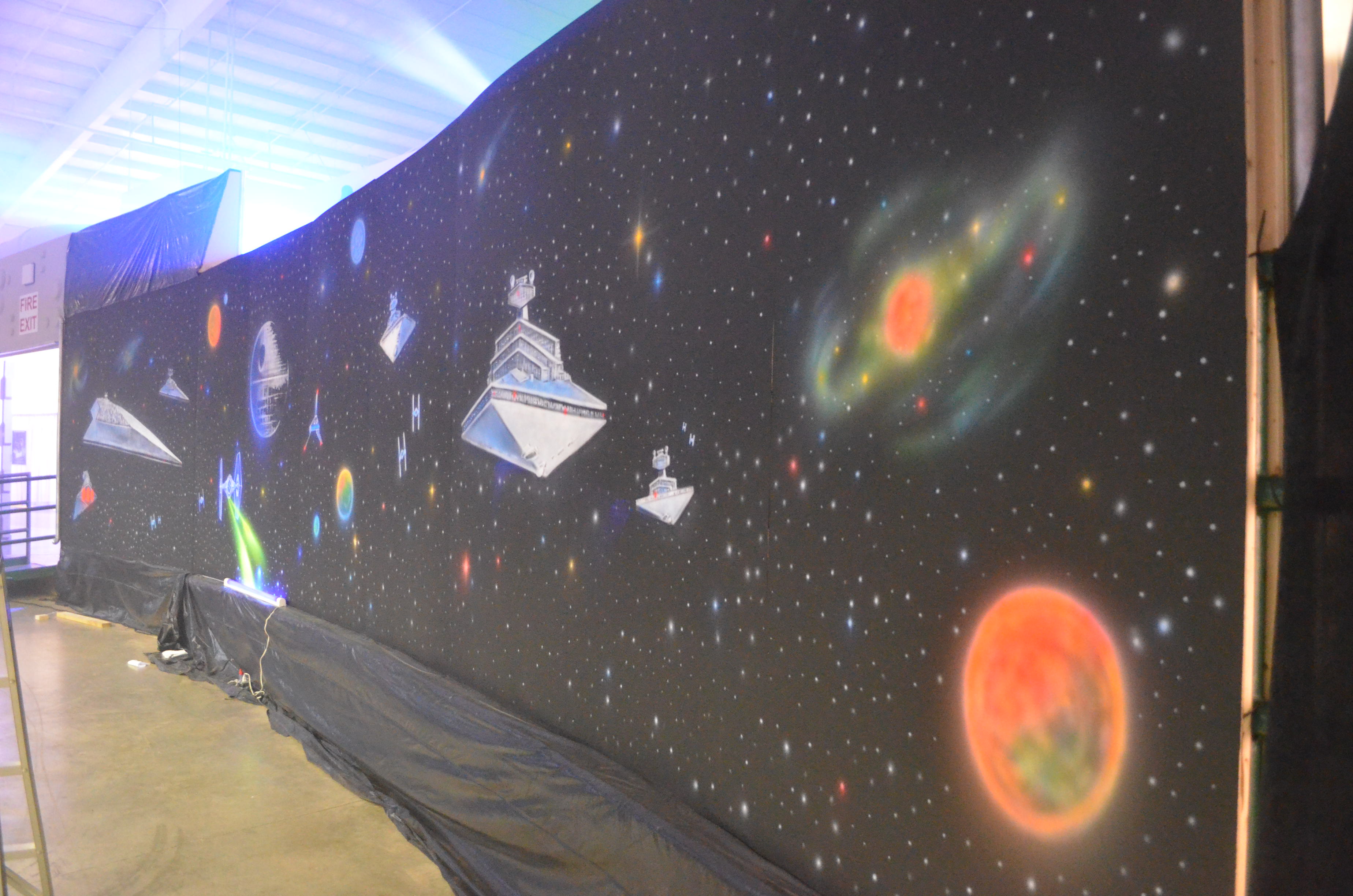 My part this year was painting two 40’+ walls with Star Wars stuffs. I wanted it to look like a giant 70’s black light poster and used some of the same 3D paint I use at the haunt.