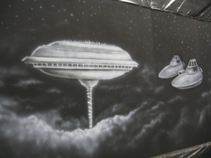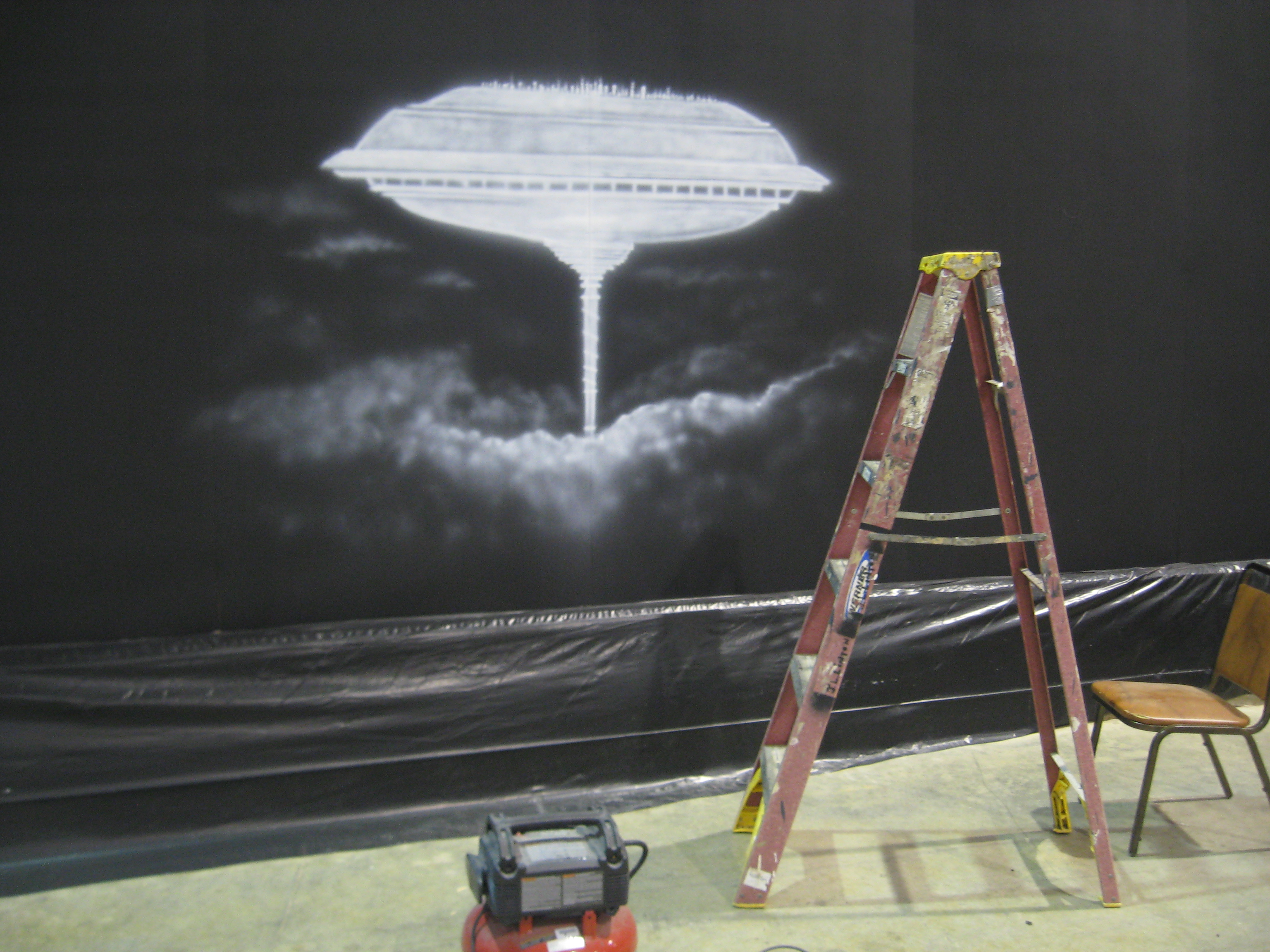 I started off airbrushing the scenes in white, then cleaning them up with black. I tried to keep it big, and would move from one area to the next as quick as I could.
