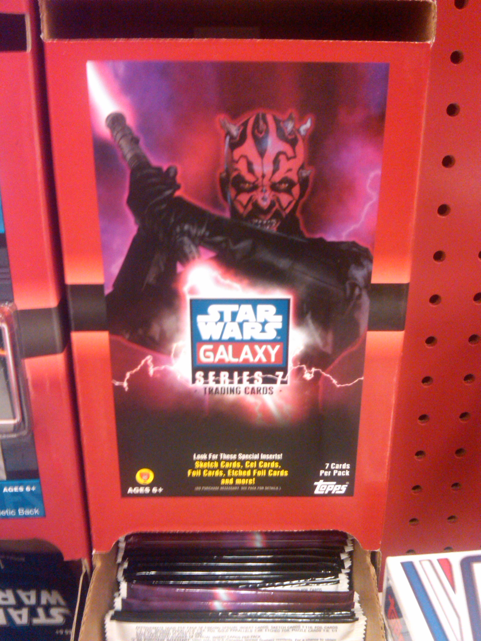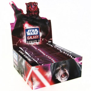 Today my wife Nicki saw them on the shelves at Target! They should now be in hobby stores and comic shops, too. They are running around $3.19 a pack in stores, or $69.95 online for a box (7 cards per pack • 24 packs per box). The set features a 120 card collection of spectacular Star Wars artwork, including 54 all-new illustrations, thematic subsets, as well as randomly inserted sketch cards, foil cards, etched foil puzzle cards, and printing plates!
