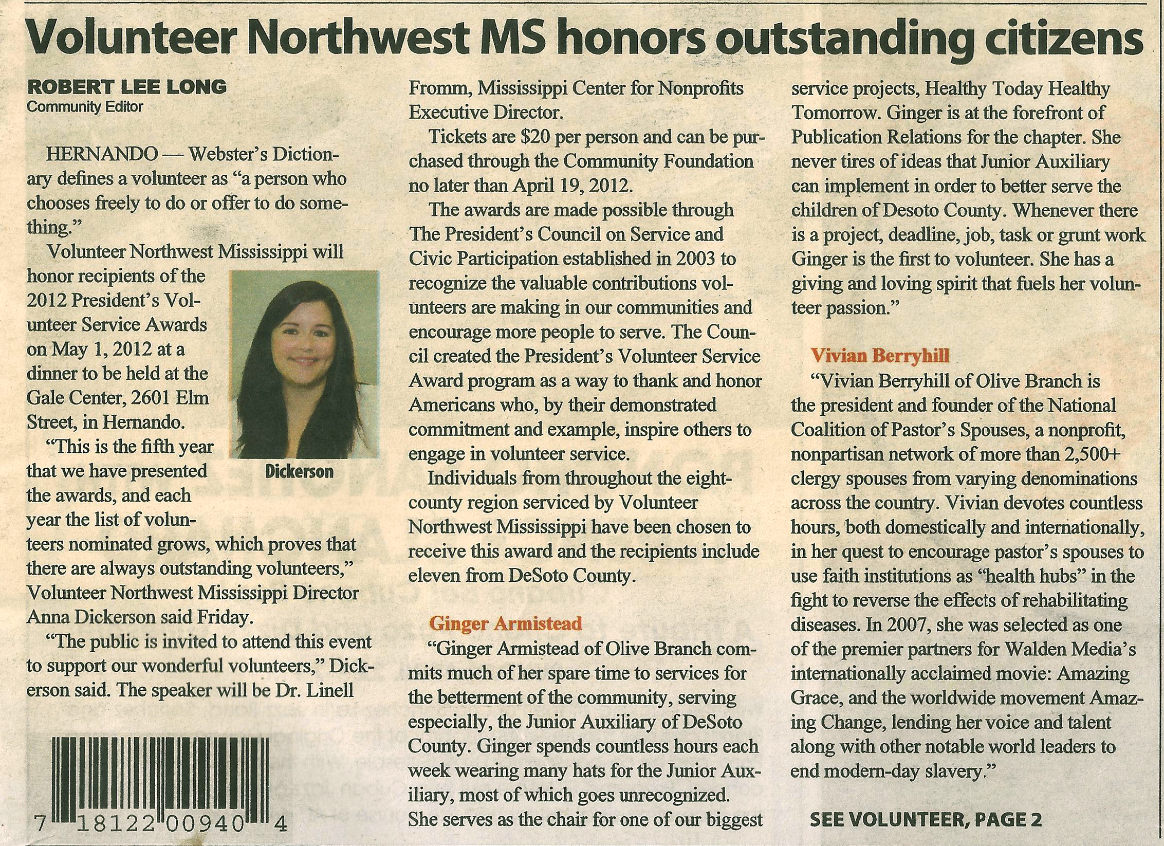 After my initial “What the..?” I continued to read on. “The award is presented by Volunteer Northwest Mississippi, a volunteer center of the Community Foundation of Northwest Mississippi, in conjunction with the President’s Council on Service and Civic Participation and the Corporation for National & Community Service.” Sounded pretty legit…