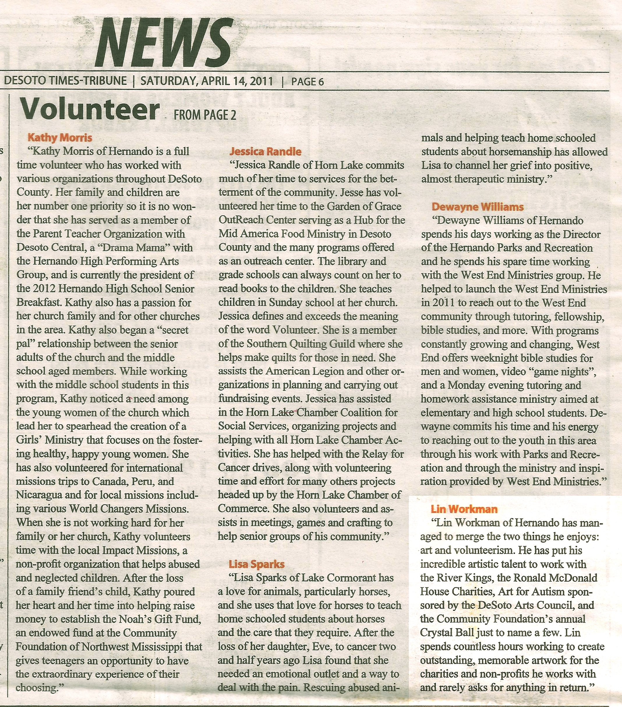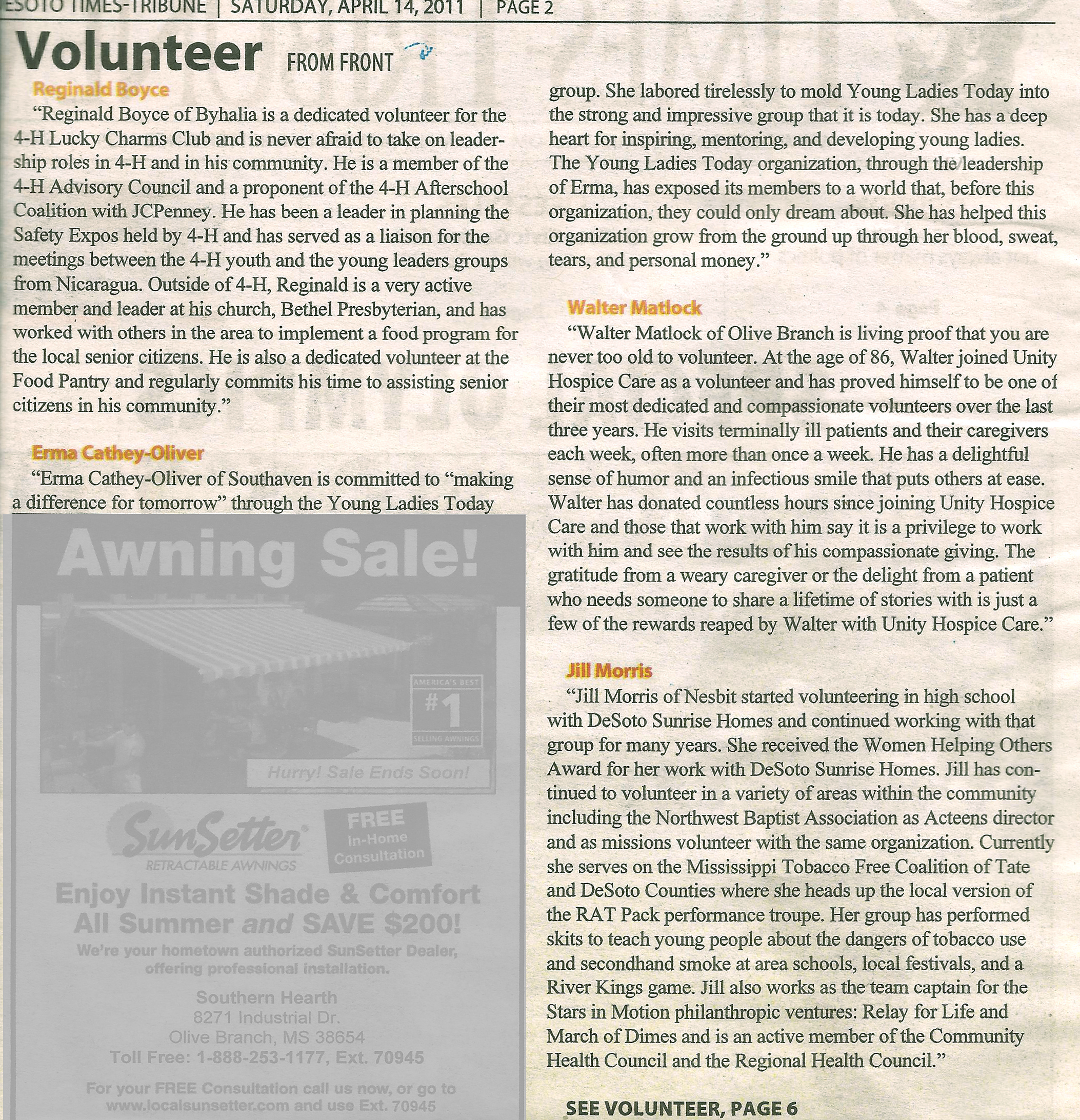 This weekend I opened the local paper and on the front page of “The DeSoto Time Tribune” there was a story on the volunteer awards!