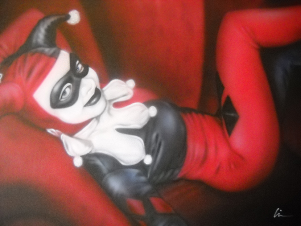 The only bat-stuff that’s not in either of our rooms is my painting of Gotham Public Works’ Harley Quinn, which hangs in the hallway that joins our two rooms.
