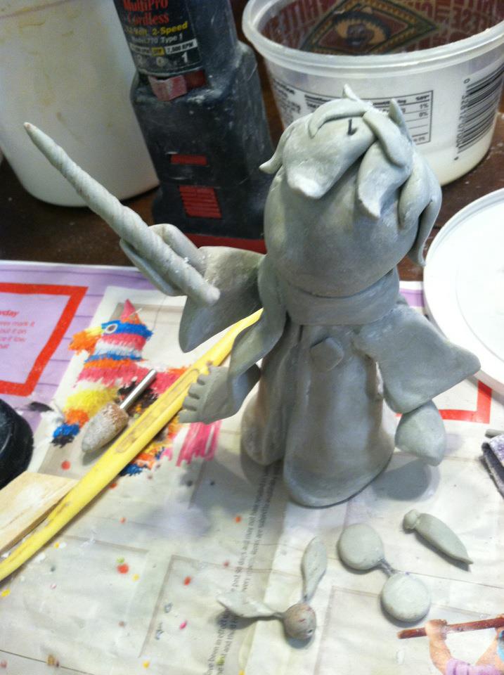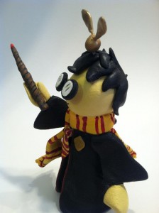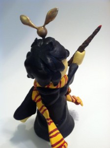 He was made from Magic Sculpt– a 2 part resin. I roughed out the form in aluminum foil (to save on resin), and slowly built up layers and details. I started off with the body and head, then arms, hands, wand, scarf, snitch, glasses, etc. I then sanded, primed, painted him with acrylics, and sprayed a fixative over him. Final height us approximately 6″ tall.