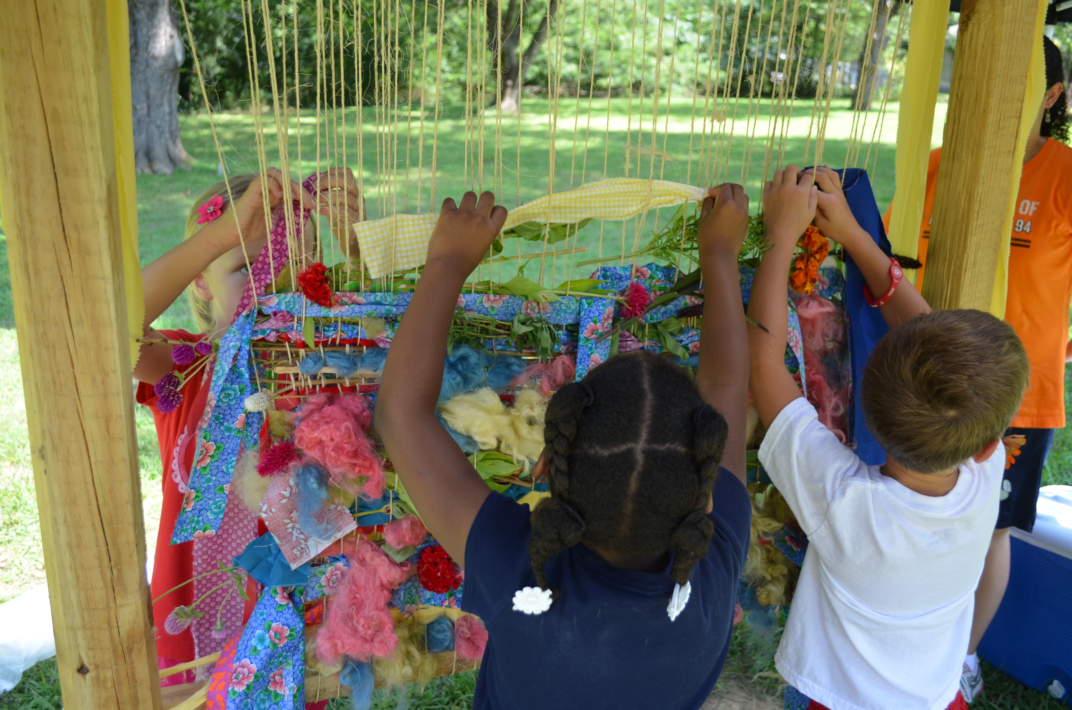 One the kids really liked on Thursday was weaving outdoors on a big loom with ribbons and some flowers they picked from the DAC gardens.