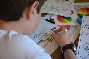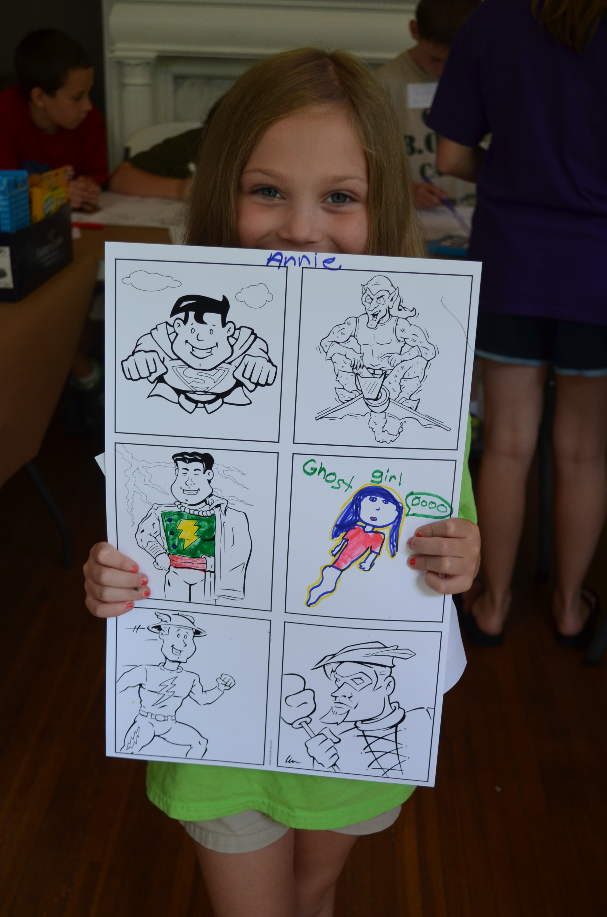 We had some posters made up for them to color, and left a space for them in the middle to draw their favorite character, or create their own character. I had a couple of the girls ask me where the girl heroes were- which is what my wife Nicki and DAC director Vicky Neyman asked me, too. Oops..! I told them, “You get to draw your favorite girl character on the poster- or you can make up your own.”- which is what some did! I had a few “How To” cartooning books with me and a couple had Batgirl and Wonder Woman which some of the kids used for reference.