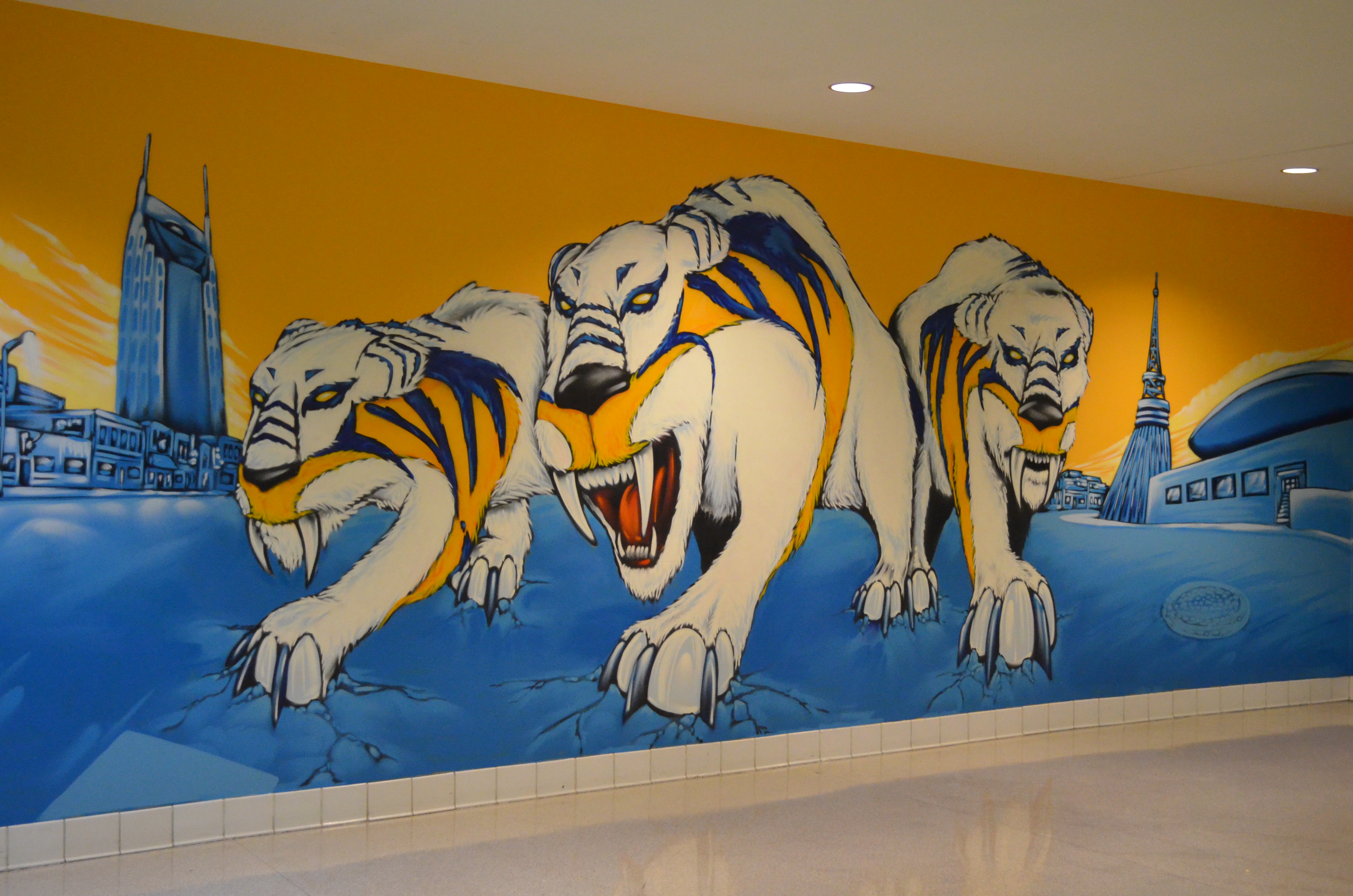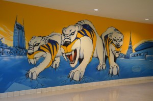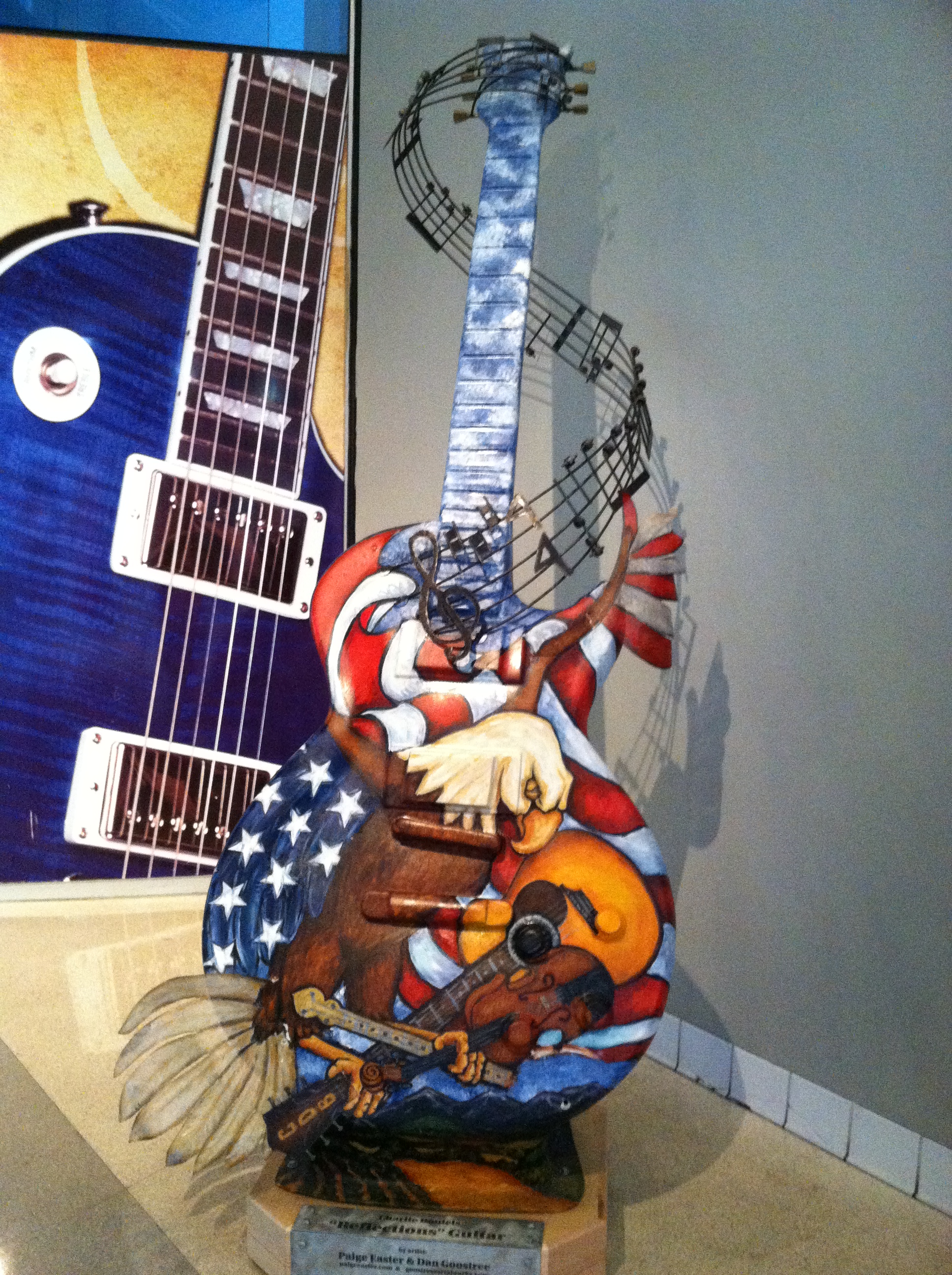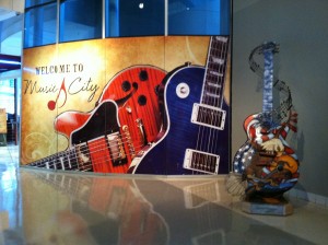 Inside by the Nashville Visitor Center there was this cool mural and custom guitar. It was one of the 10′ tall fiberglass guitars for Nashville’s GuitarTown Project. Very similar to the Germantown horses or U of M Tigers around Memphis.