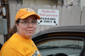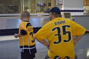 The next morning we loaded up the Batmobile and headed up I-55 to Memphis. It’s about a 3hr or so drive to Nashville, and once out of Memphis it’s pretty much a straight shot up I-40. We both were wearing our newest gold tees with the latest Predators logo on them. Nicki was wearing #6, captain Shea Weber on the back of hers, and I had #35, Pekka Rinne (the Preds’ goalie) on mine.