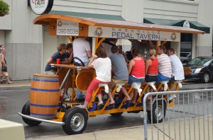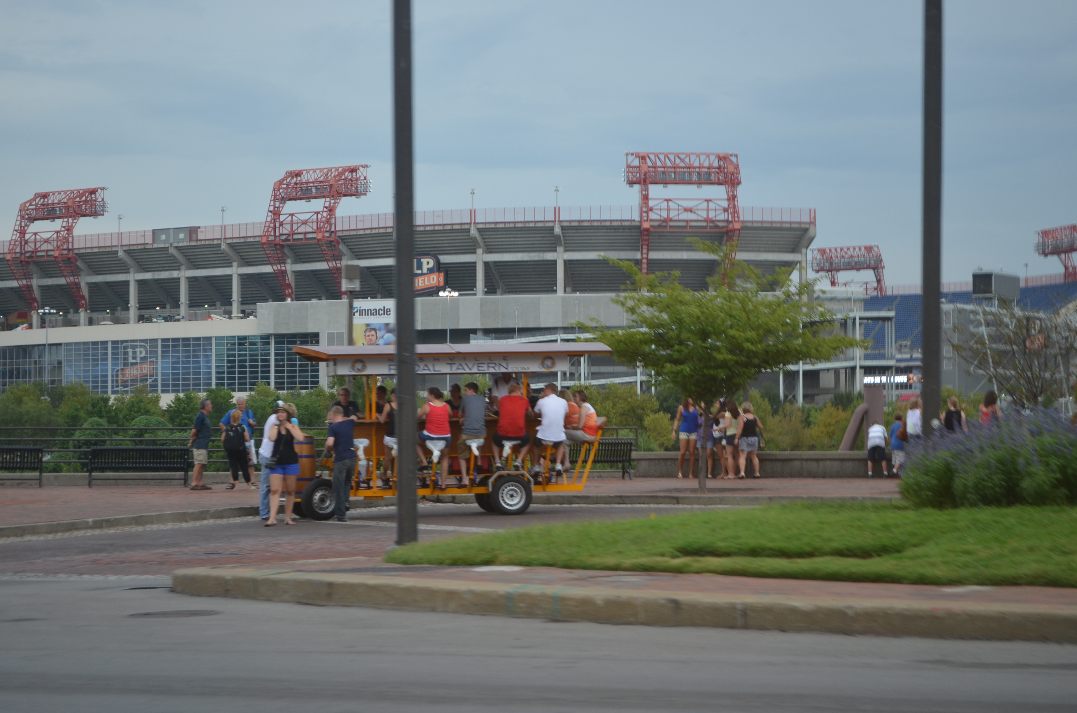 We headed back towards downtown and Broadway, and passed the Pedal Tavern parked beside the Cumberland River, just across from LP Field– the home of the Tennessee Titans.