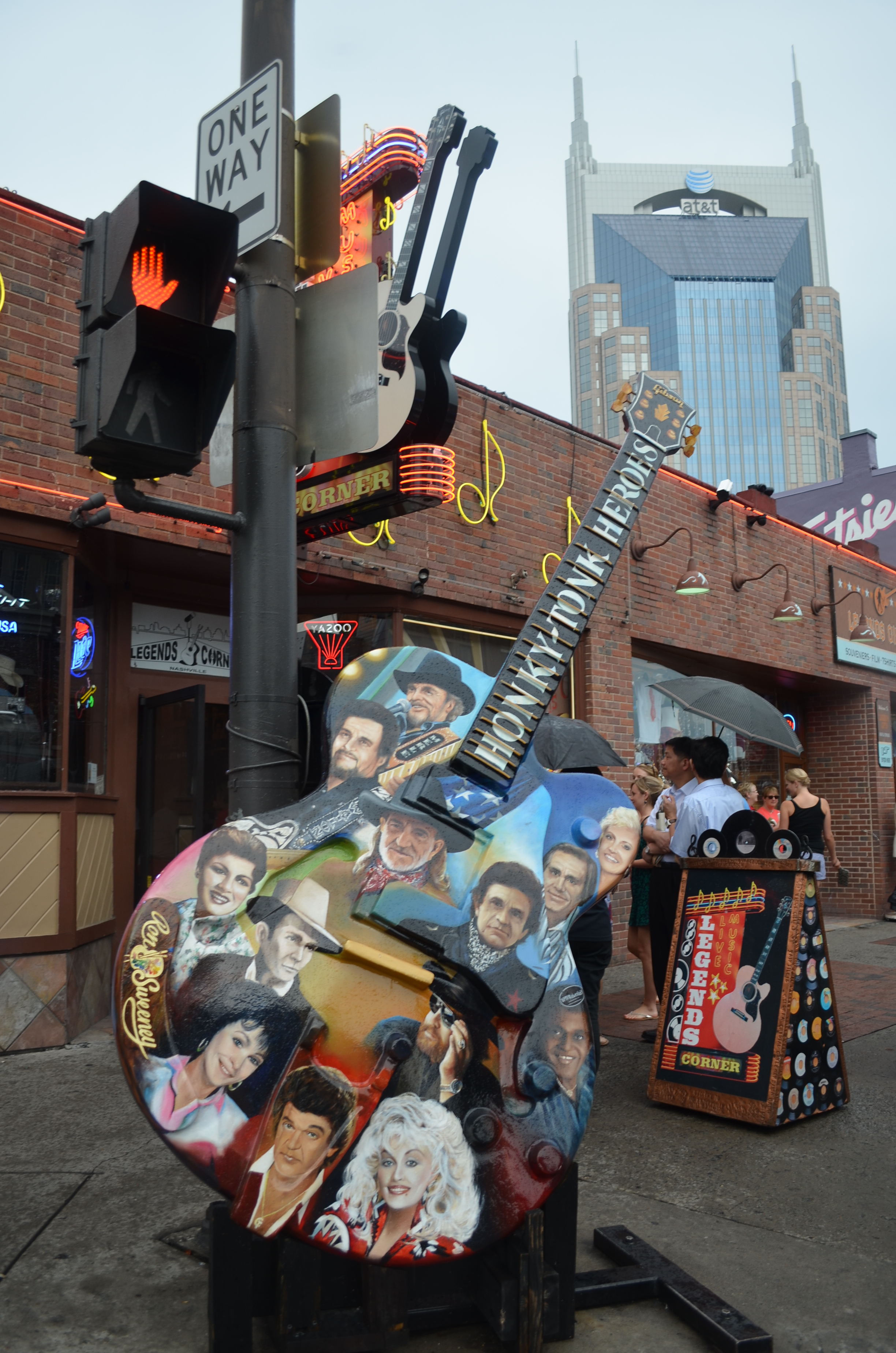 We crossed Broadway and headed up 5th Ave. Across the street from the arena we spotted another guitar outside Legends Corner. This one covered in famous country music performers by Nashville artist Ron Sweeney.