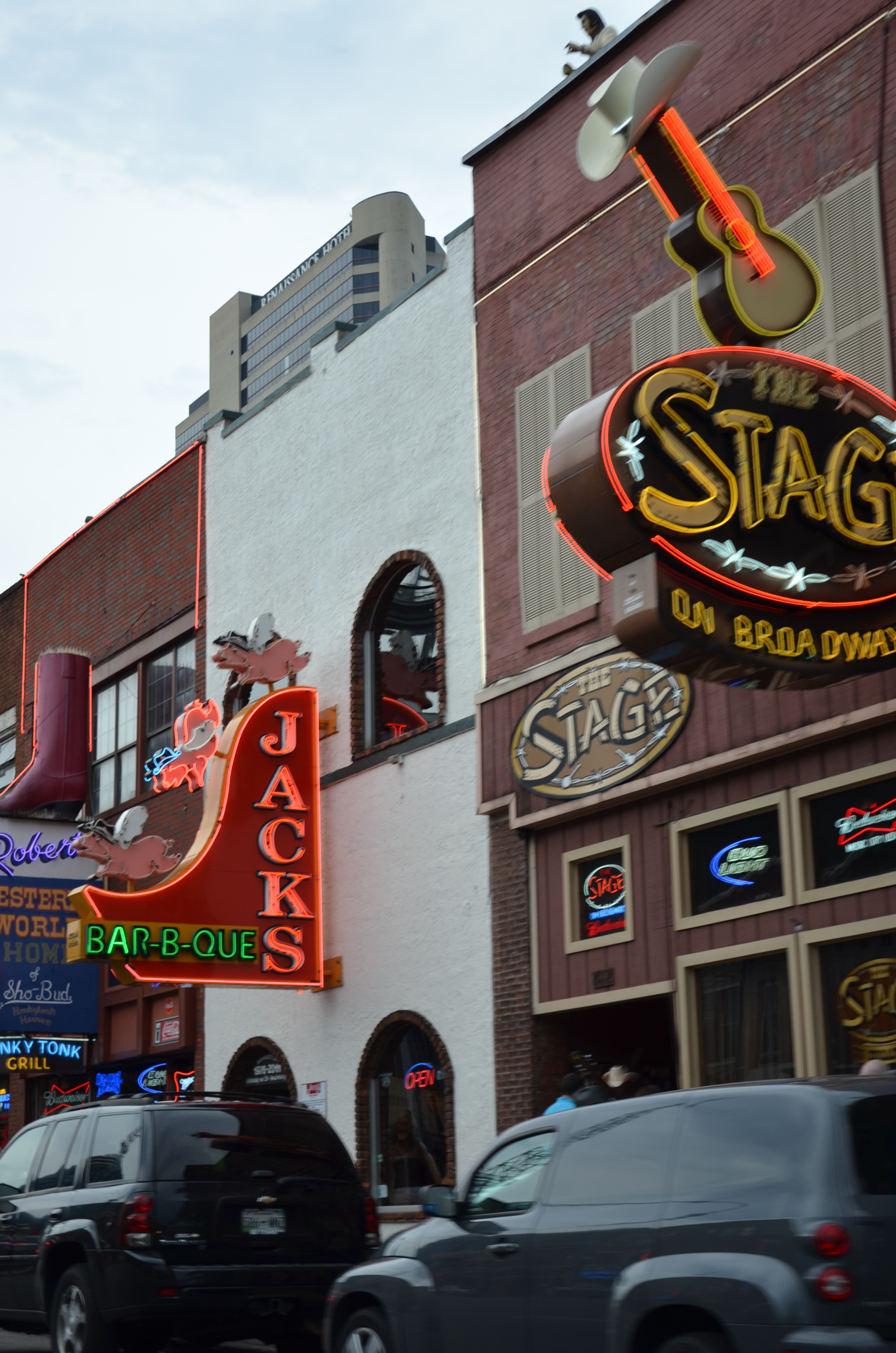 Broadway is Nashville’s equivalent to Memphis’ Beale Street or New Orleans’ Burbon Street. Hey- there goes ELVIS! (top of the building) “Yo, King!”