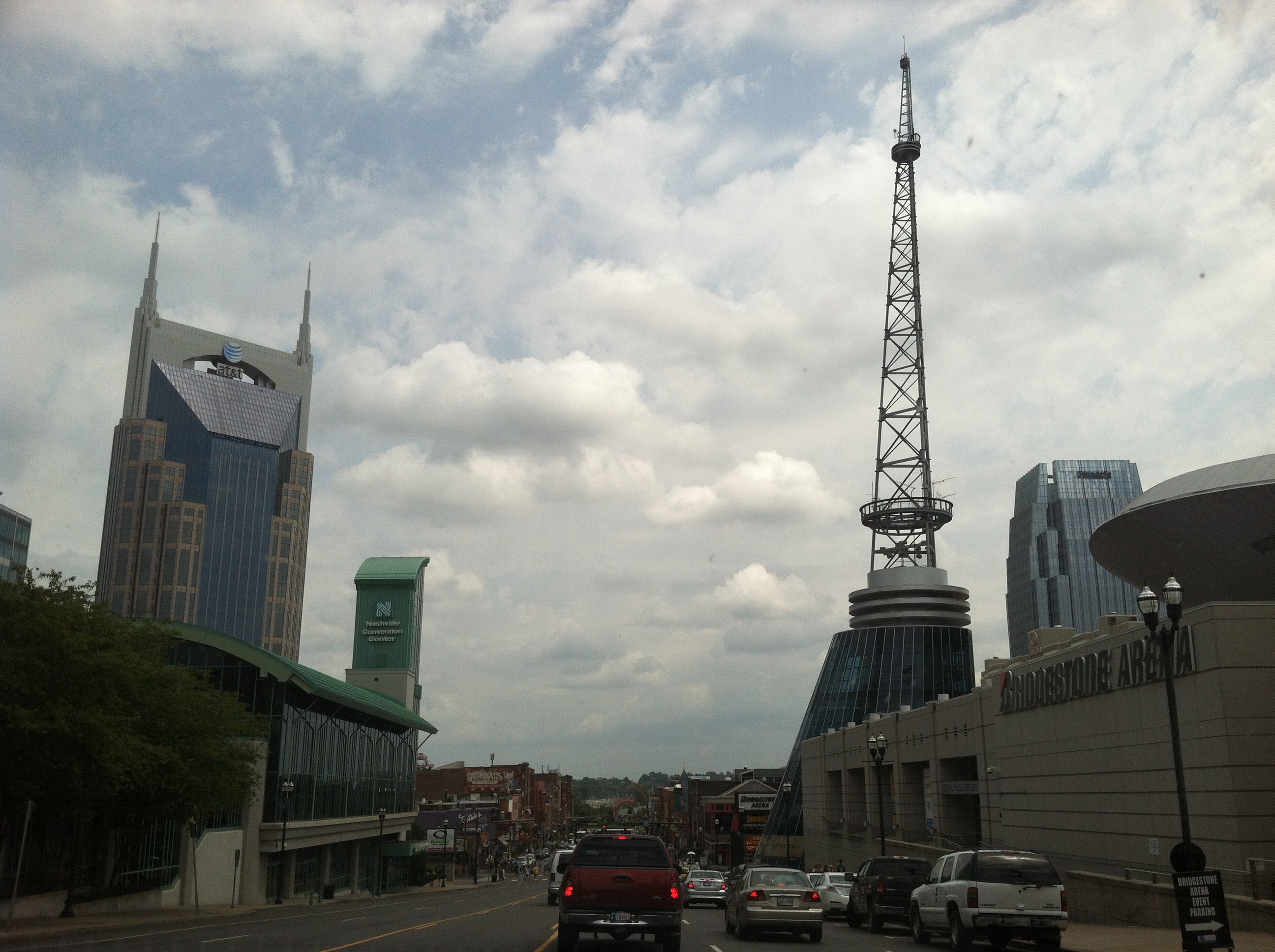 We hit Broadway in Nashville around noon. After finding a parking garage up the street we grabbed our skates and cameras and headed back down the street to Broadway and the Bridgestone Arena. That’s it on the right, and the Bat-building on the left.