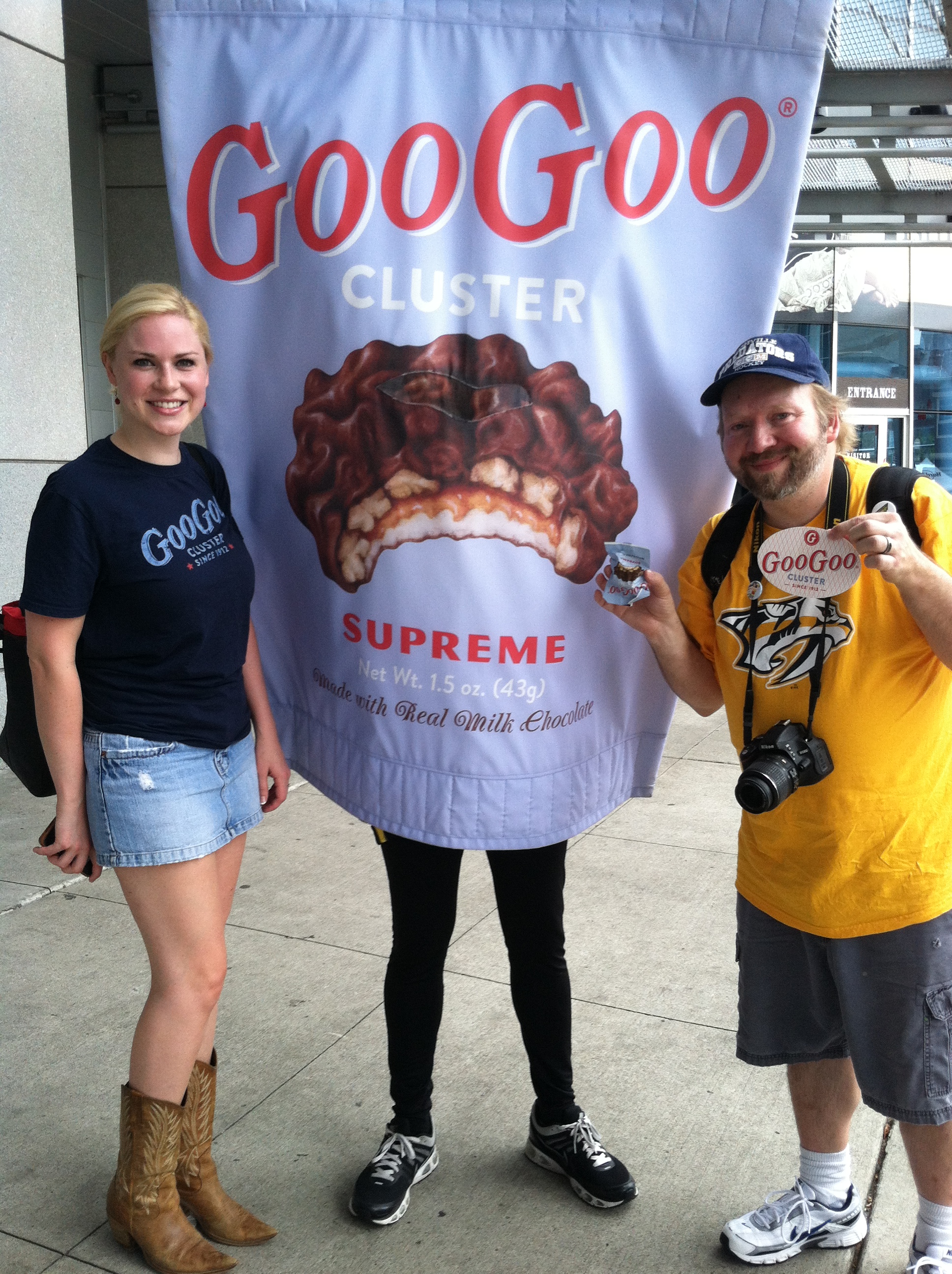 There was a party going on in the plaza and we both got a free GooGoo Cluster (which are made in Nashville) and GGC sticker before entering the arena. I ate the GooGoo Cluster later while waiting in line for the used equipment sale inside. Quite tasty!