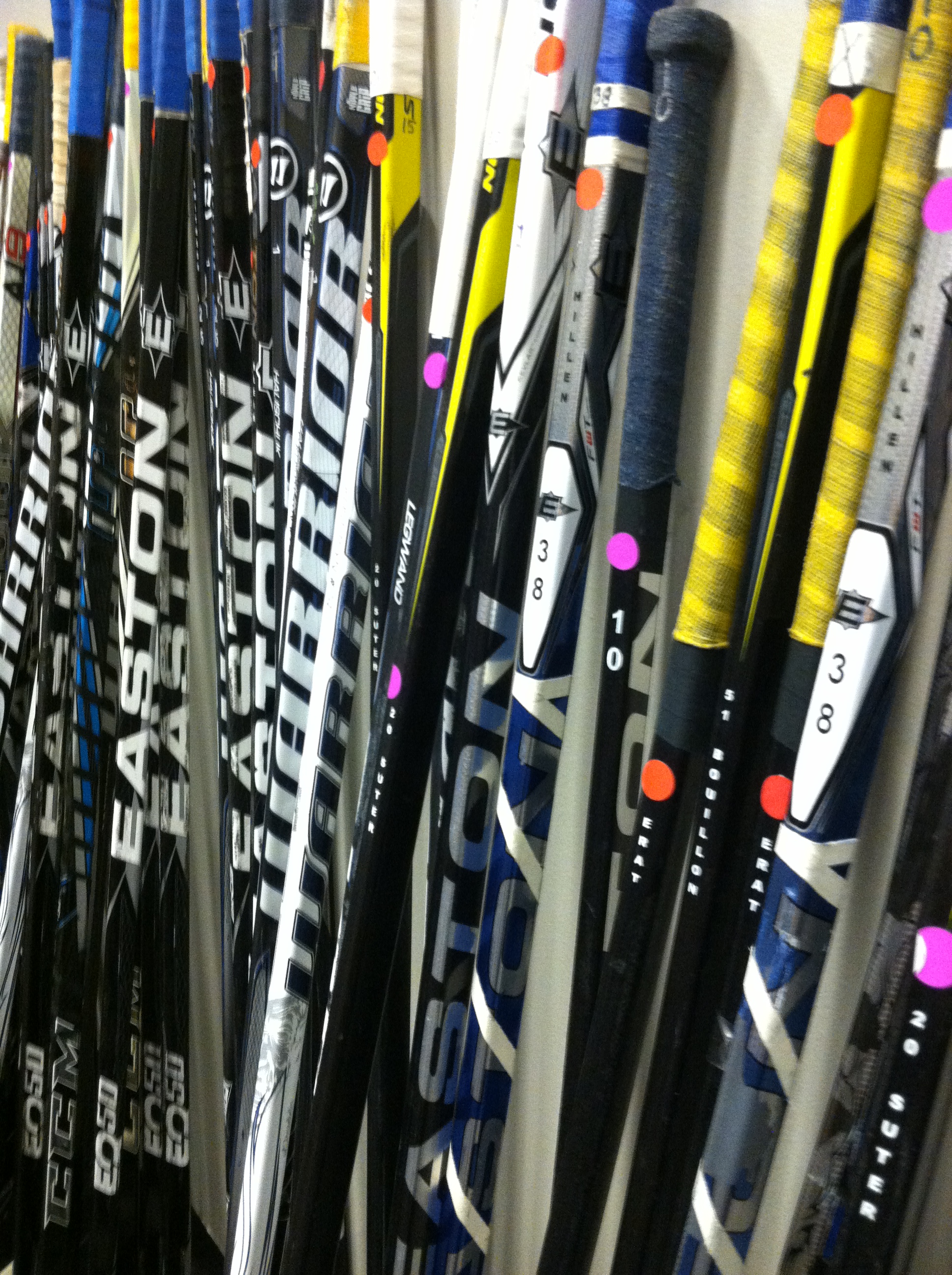 Nicki couldn’t find a helmet that fit her, but was able to pick out a couple hockey sticks she liked. She also picked up a couple player locker name plates and a pair of hockey socks.