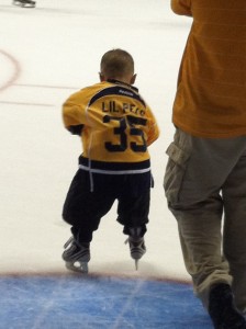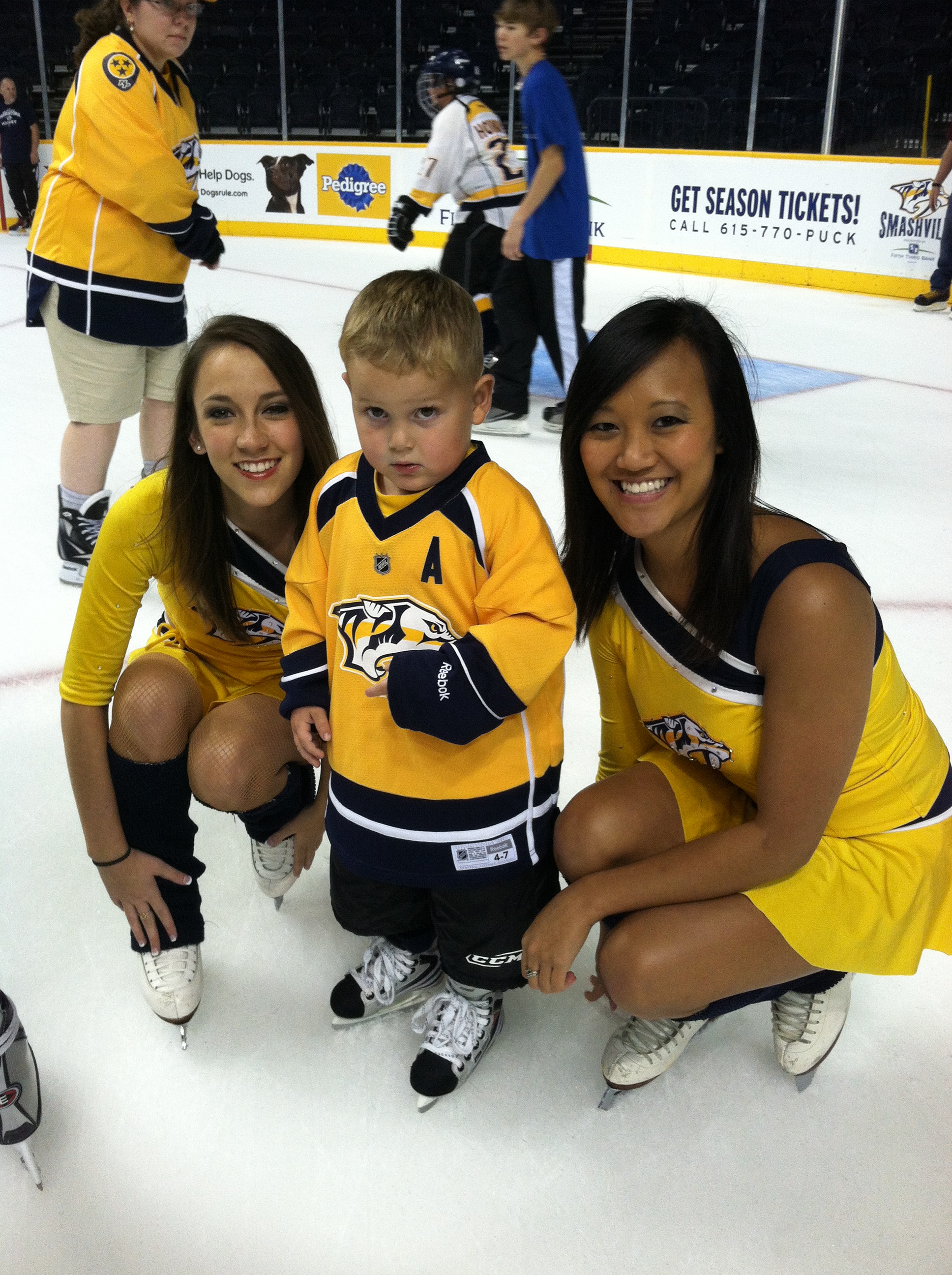 As you can see he’s already a chick magnet as he poses with a couple of the Nashville Predators Ice Girls.