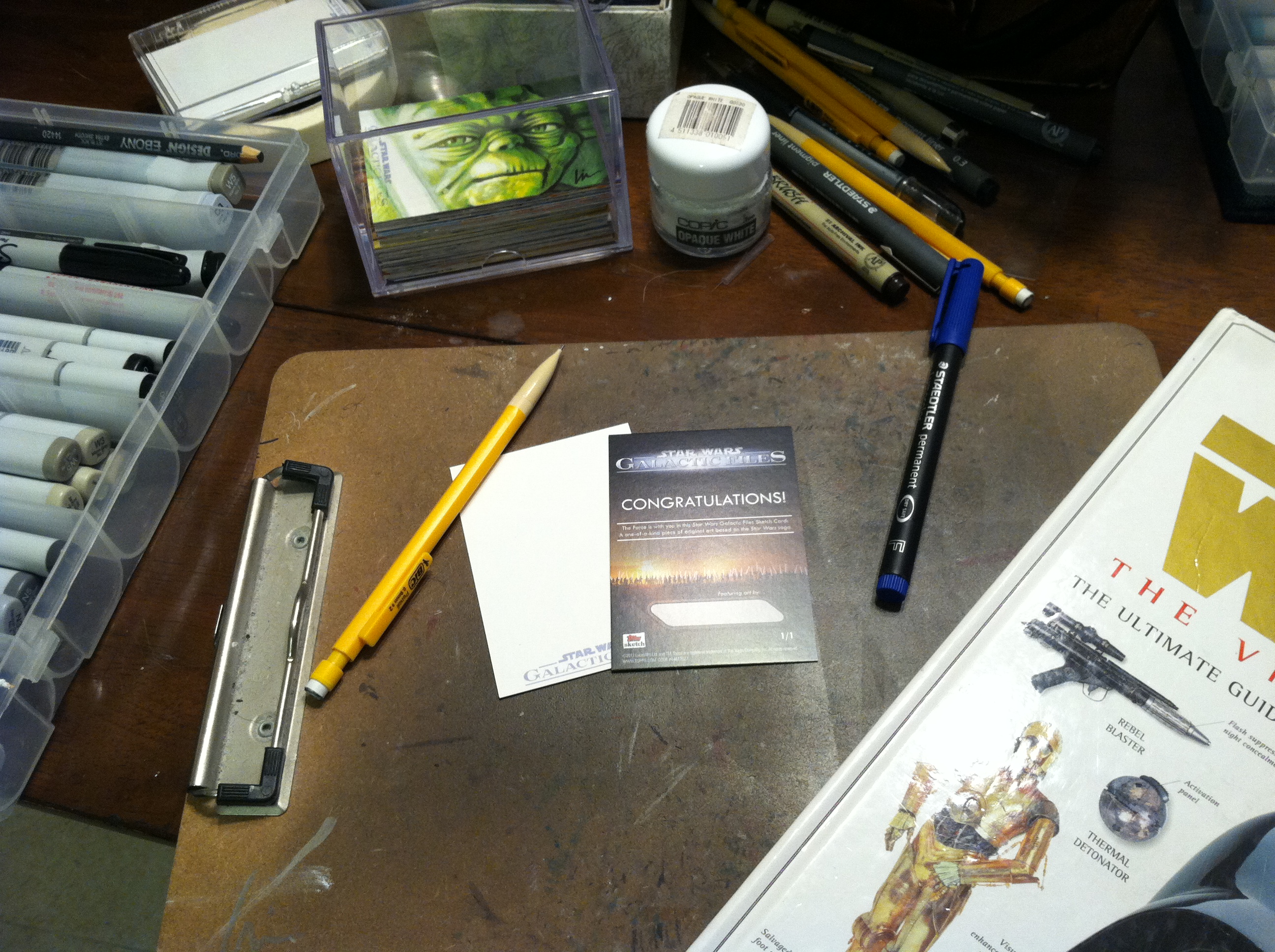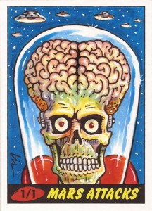 But WAIT- that’s not all! If you act now I will also send you a quickie personal sketch card drawn by me. If you order a Star Wars card, I’ll do a Star Wars character (of my choosing, but feel free to let me know who your favorite character is)- and if you order Mars Attacks I’ll draw a Martian sketch. They will either be black/white, grey-scale, or color, but will be cool and fun- and yours FREE with your paid order, along with a personal thank you note for ordering.