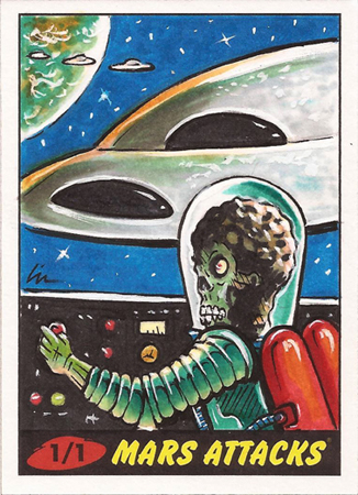 These sketch cards normally go for $155.00-$185.00 on my site, and have gone even higher on eBay! I have several Star Wars (Galactic Files and Galaxy) and a couple Mars Attacks artist returns cards available.