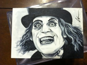 So far I’ve done 25 sketchcards and will be doing a few more. I’ll have at least 6 artist returns for sale on my site, and the set is scheduled for release later this year in September. I’m also working on two other sketchcard sets- one is a “Carnival” set for Viceroy Card Company, but I can’t talk about the other one…yet! 😉