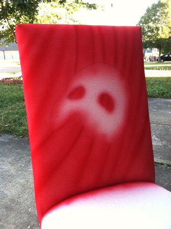 Finished it by spraying some metallic gold, red, and purple lightly over the chair. Then I heat set the paint with an iron and sprayed it with some Scotch-guard.