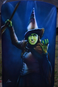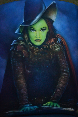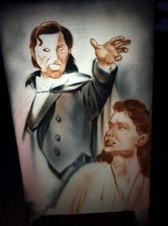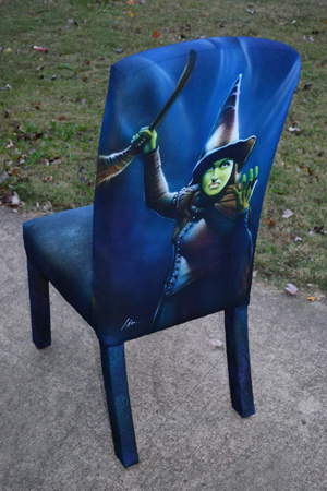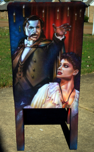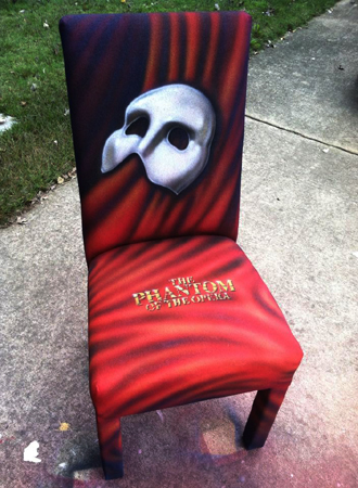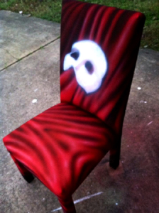 This year I painted another canvas chair for the auction- the Broadway version of “The Phantom of the Opera“. This was the fifth chair I’ve airbrushed for the Orpheum Theatre and was back stage in the silent auction (you can see my Frank paintings in the background in the left photo). Hard to tell in the photos, but I used Createx airbrush pearl colors which make it shine and sparkle a bit. Used some on my “Wicked” chair last year as well.