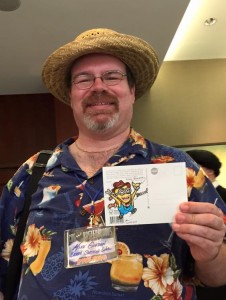 Awesome idea I’d love to see more people do- writer Michael Gordon sends a postcard to his nephew from each city he does a con. After saying a “Great con, wish you were here.” type of greeting many times, he started having people do sketches on them. Fun! I was happy to draw a Dr. Who minion (with a 4th Doctor scarf and hat holding a sonic banana) for him on a NASA postcard. He in turn gave me some of his comics and a CD!