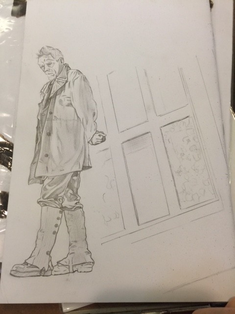 I started off penciling the drawing first, and making sure the TARDIS wrapped around from front to back properly. I wasn’t completely finished with the pencil drawing early Saturday morning when a lady asked me if I planned on selling the comic. I told her I’d be happy to sell it, but since it was a front/back illustration it may not be done by the end of the day. She said her and her family were there for the weekend and she could pick it up Sunday before they left the con.