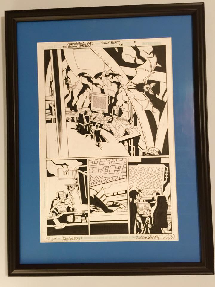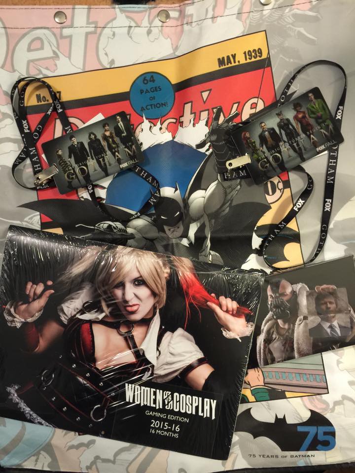 I’ve been sick with a sinus infection for almost a week, and the meds I had to take for it really messed my stomach up. Didn’t eat for a few days- mostly just juice, Powerade, and crackers. Even Jello was hard to stomach. Saturday I felt good enough to get out, grab lunch, and run a few errands with Nicki, which included picking up my framed “Batman Strikes” comic page for the Batcave. Got a surprise call that morning from Michael’s telling me my framing order was ready to be picked up several days early. It was Batman Day– so it seemed appropriate, and a cool coincidence. The page is now hanging in the Batcave at home. It’s pg8 from issue 46 of “The Batman Strikes” comic series drawn by artists Christopher Jones and Terry Beatty. I have been wanting to get it framed since I bought it from Terry at Midsouthcon a couple years ago, but wanted to wait for the Batcave remodeling. I dig that it’s a scene in the Batcave. Also got a package the day before from our friends Anabel and Allen out in Arizona. They sent a cool cosplay calendar and card set, Gotham lanyards, big Batman bag, plus a bunch of other pins, buttons, signed comics and more swag from this years San Diego Comic Con. Really made my day when Nicki got home and opened the package from them.