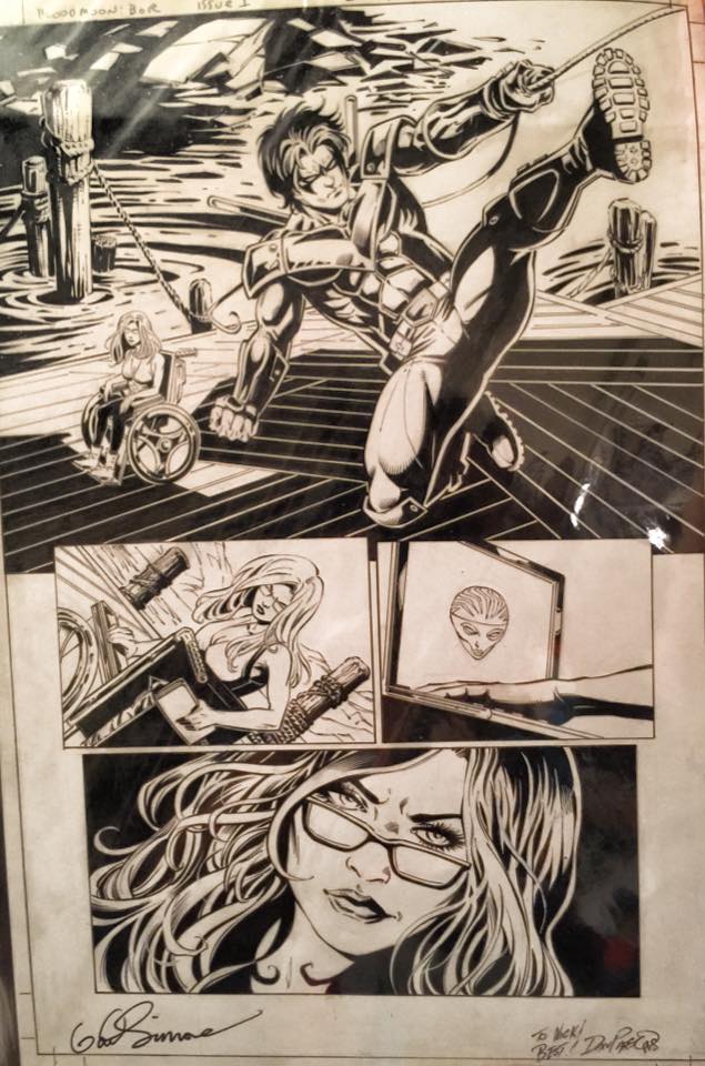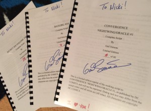 Nicki brought along her “Oracle/Nightwing Convergence” comic page to get signed by Gail, who wrote that issue. The art was done by Jan Duursema and Dan Parsons. She already had Dan’s autograph on it, just have to get Jan’s now.