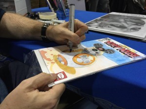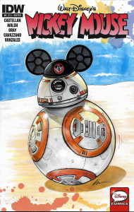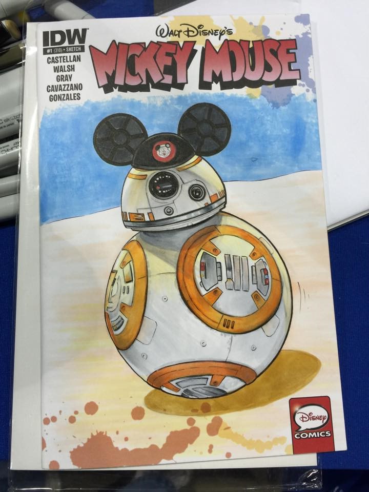 This year while I was sitting in Artists Alley at RCCE I worked on a Mickey Mouse sketchcover at my table. I had picked up a couple on our trip to ConK2015 in Huntsville, AL this summer. On this one I drew the new Star Wars “soccer ball” droid- BB-8.
