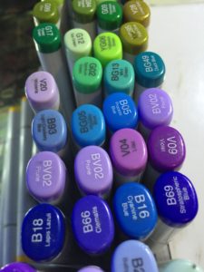 I used Copics and Microns on this cover. A lot of the white powder was done with Copic White and a brush.