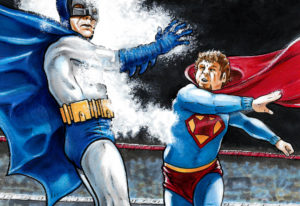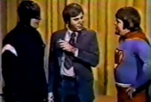 Well, growing up I got to witness all those worlds collide on my TV screen. Back in 1976 Adam West/Batman was in Memphis appearing at a car show at the Cook Convention Center and stopped by the studio where the local wrestling was shot. During the TV interview with wrestling host/commentator Dave Brown (who insists Adam was NOT drunk, just campy), Batman (Adam wearing a Batman cowl, gloves, and track suit..!) faces off with Jerry Lawler dressed as the evil Superking. It was one of the most vivid, and bizarre moments I witnessed on TV as a kid. The two didn’t actually face off in the ring, until now…