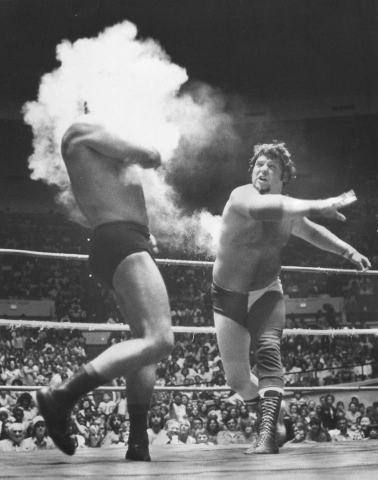 When Mark sent me some pics and said he wanted Lawler throwing powder in the face of a Neal Adams era Batman, I was thinking more Adam West Batman since he and Lawler had been on TV together- and maybe Lawler in the Superking tights he wore on the show, and Adam in the full Batman costume (and not the track suit). Mark agreed and I got started merging it all into an image.