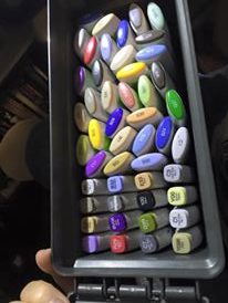 I keep them next to my drawing surface in some plastic sliding drawers. I used to keep them on a shelf under my desk but the new metal shelf makes them much easier to get to. In the left photo, the larger one on the right is great for traveling to cons, and was given to me by my mother-in-law. I also keep my wider markers and refills in a couple plastic ammo boxes that my wife got for me from a sports equipment store. They can be stacked and are great for traveling, too. I really like the Copics because they come in different sizes and can be refilled. In the right photo those are wide one on the top and refills on the bottom.
