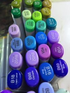 Once the pencil drawing was complete on the front and back I broke out my markers. I use mostly Copic Markers, but also use Letraset and Prismacolrs when needed for certain colors.