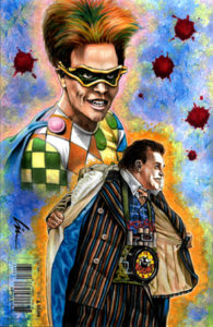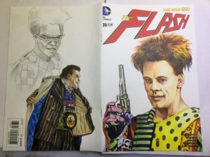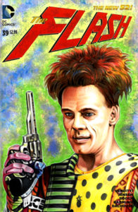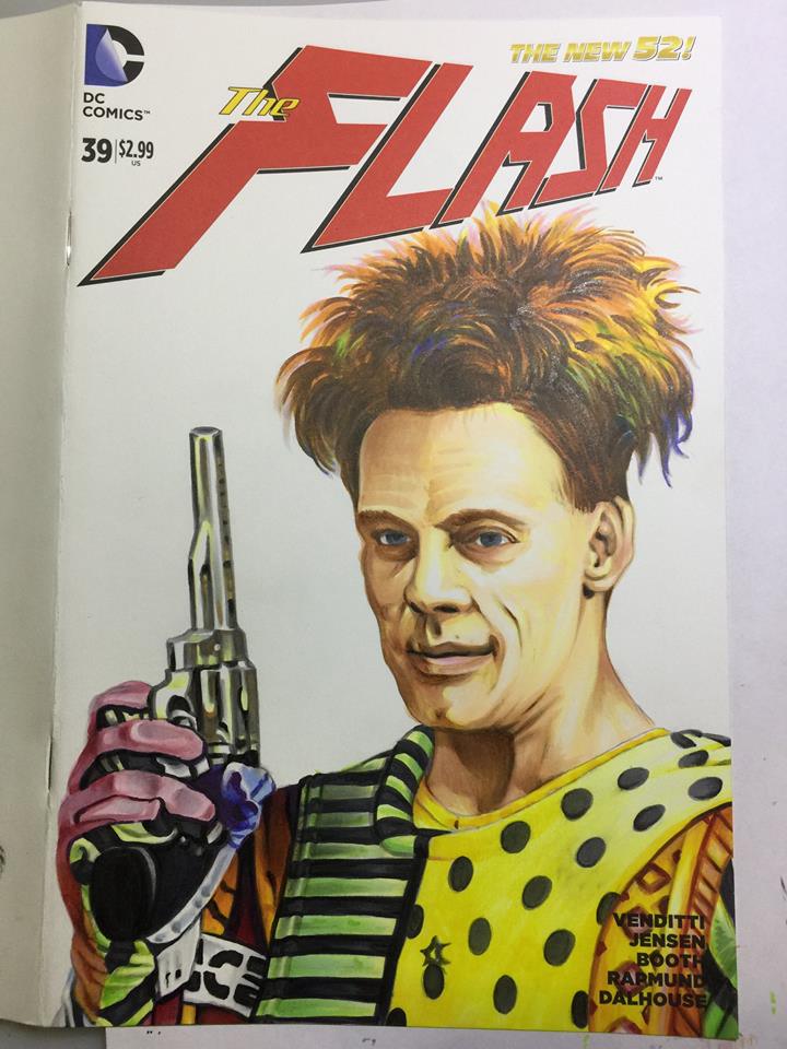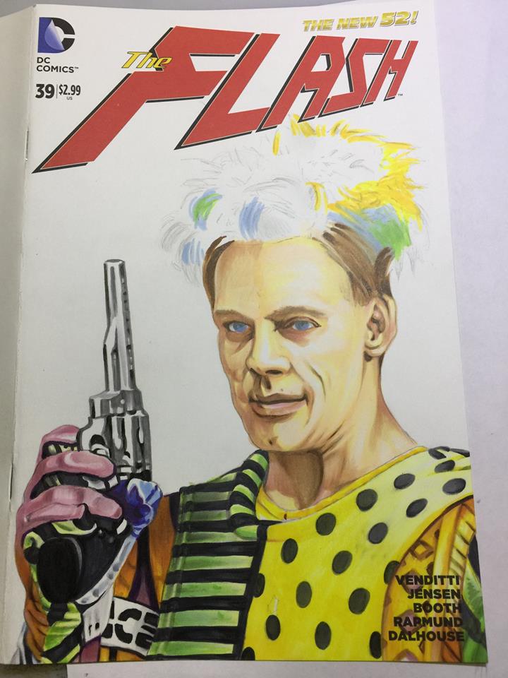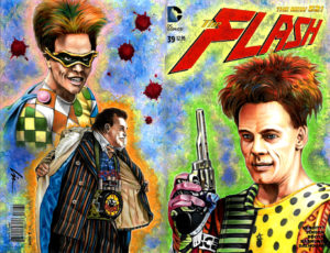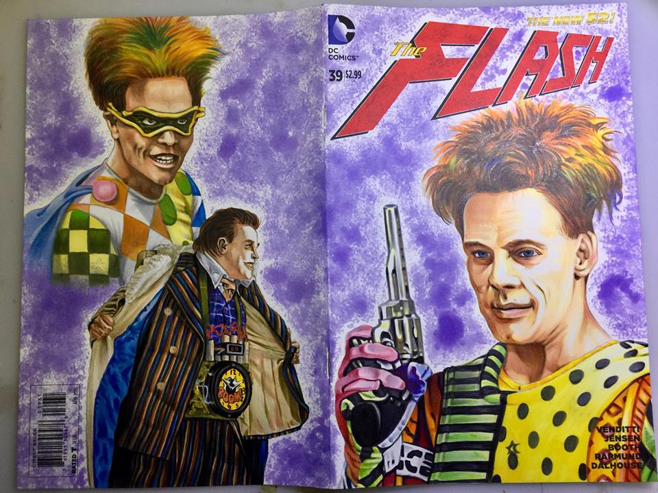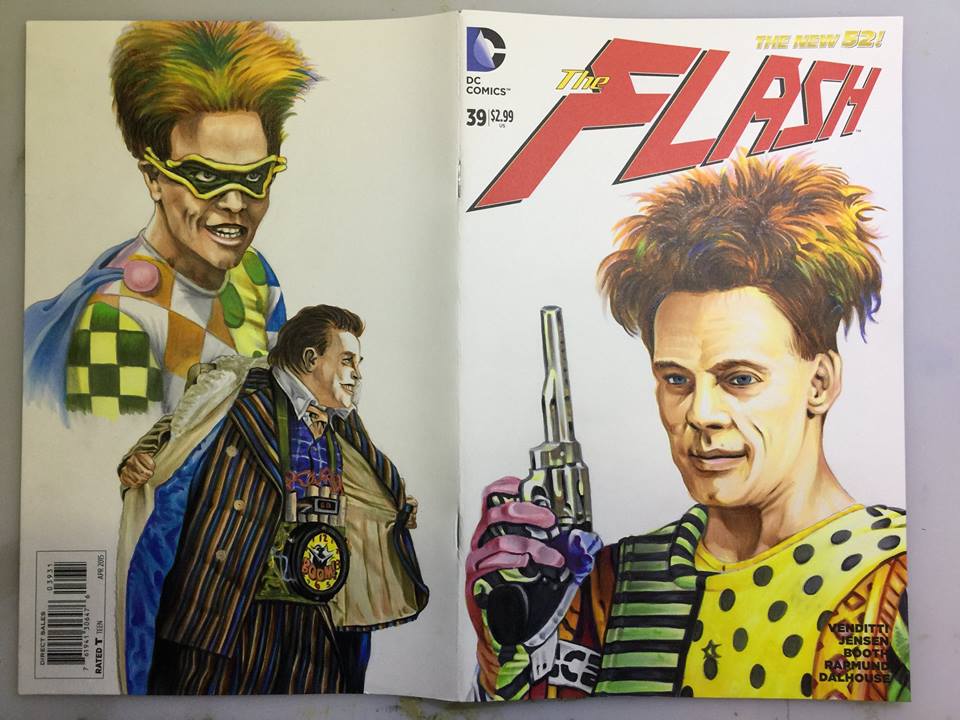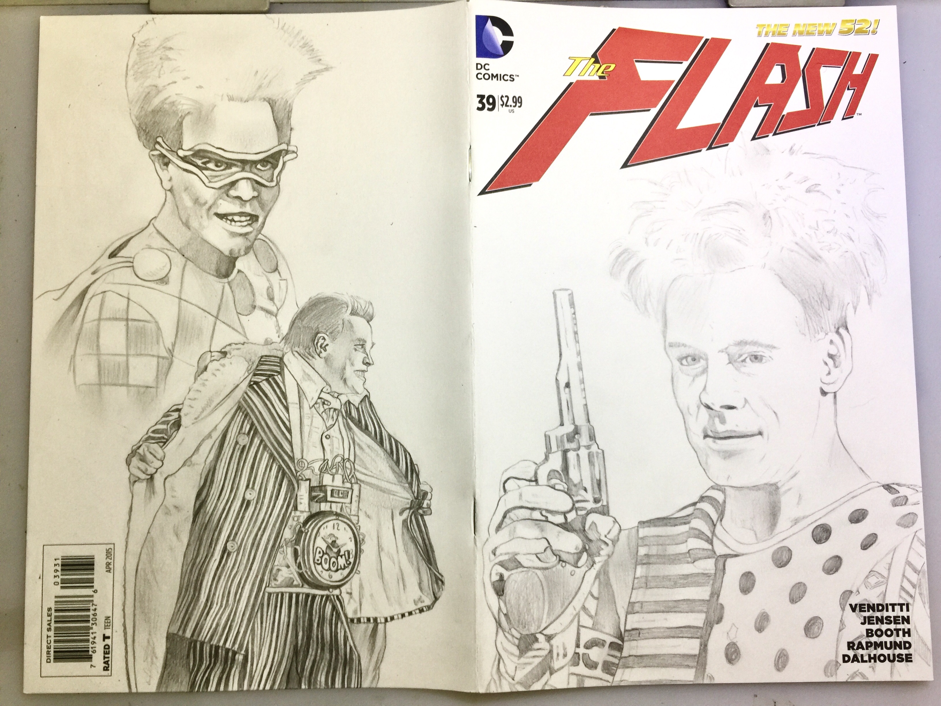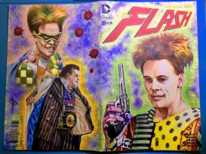 I recently completed a special sketchcover to celebrate the Comic Book Central podcast’s 4th anniversary. I listen to the podcast a lot while working in my Batcave studio, and occasionally email the show. I asked CBC’s host Joe Stuber if he’d like to do a sketchcover giveaway. He’s done special prizes for other giveaways over the years, and dug the idea of doing a comic. He suggested it should be a guest from this past year’s interviews. We both agreed Mark Hamill would be a fun choice. I loved him as the Trickster on the original CBS Flash TV series back in 1990, and was happy to see him make guest appearances on the new CW Flash series. I did a version of his first and second appearances on the ’90s Flash show, and one of him as the Trickster of Earth 3 (although he looks kinda like the “Jokester“) from the current show. I thought about adding his latest non-costumed “Jesse James/Trickster” persona from the current show, but felt it may become a bit crowded, so I just stuck with these three.