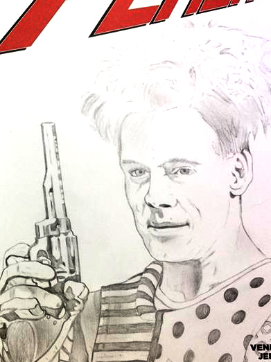 I then took pink, golden yellow, green, and light yellow markers and outlined the figures and logo- and lightly blended the colors with the background effect. I stippled a slightly darker blue here and there in the background using the same previous technique withe the toilet paper and refill bottle. I wasn’t happy with the space along the spine of the comic- it looked a little “dead”. So I took a red refill and dropped a little “blood” onto it. Once I did a few more details with the markers, I came back with a white Prismacolor pencil and a white Gelly Roll pen and did some highlighting. After the drawing was done I sprayed it with a fixative to seal and protect it.