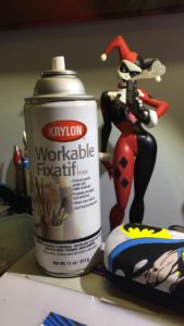 Once finished I sprayed it with a matte fixative (I use Krylon Workable Fixative). There may be better out there, but this one is usually pretty easy to find at art/hobby stores or even Walmart.