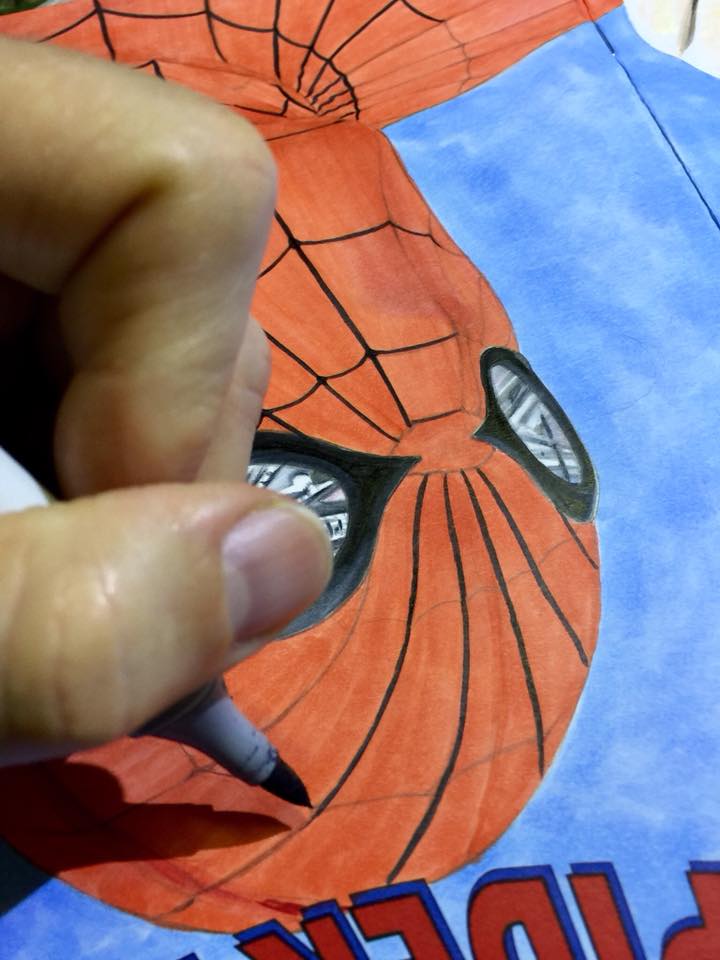I couldn’t see a lot of the details on the camera, webbing, and face while lightboxing so I had to enlarge the reference photo on my computer to tell what I couldn’t make out. Decided to add a reflection of a subway train in his lenses instead of just having them silver’ish.