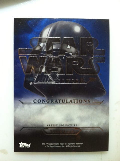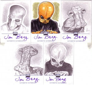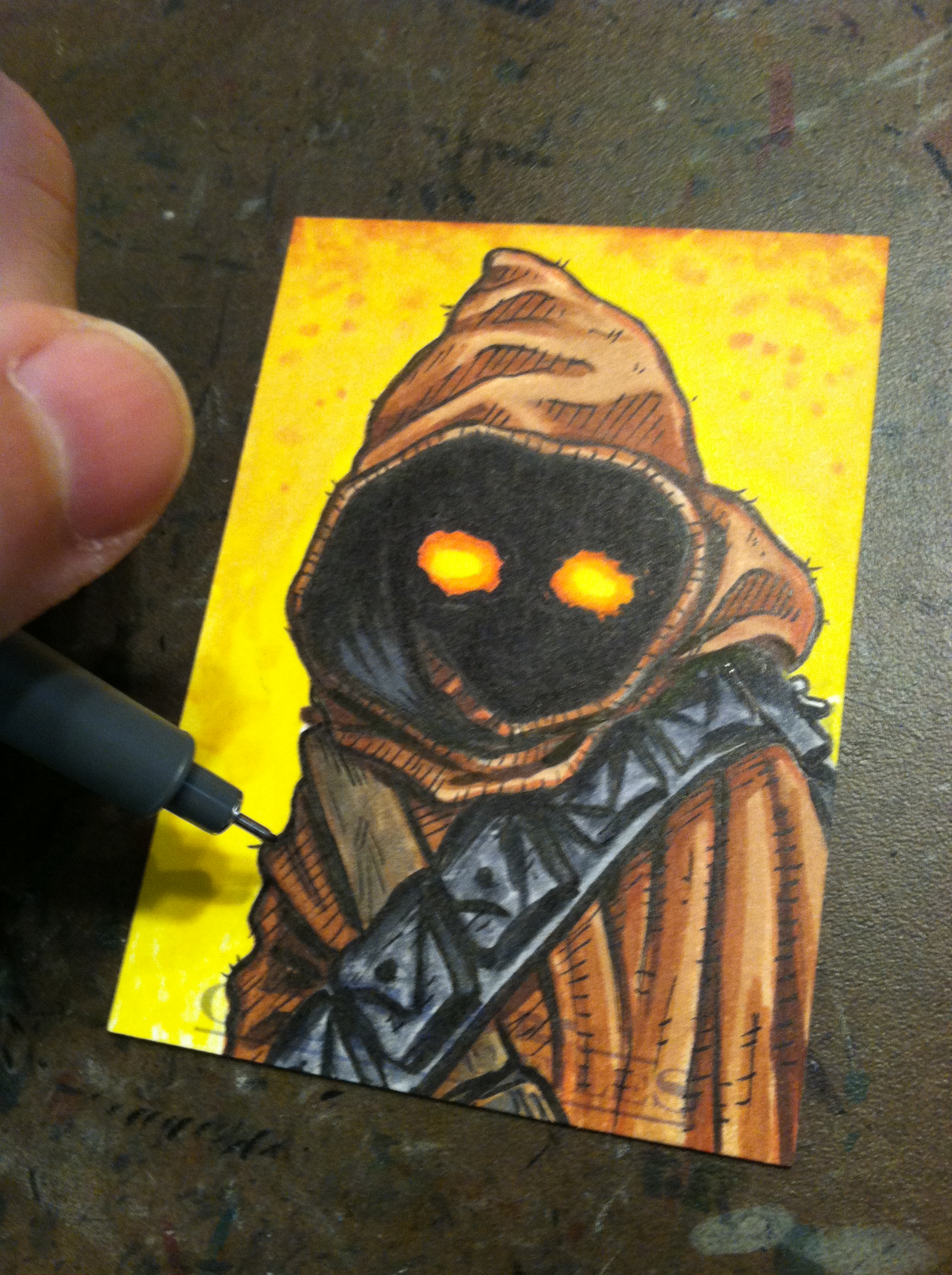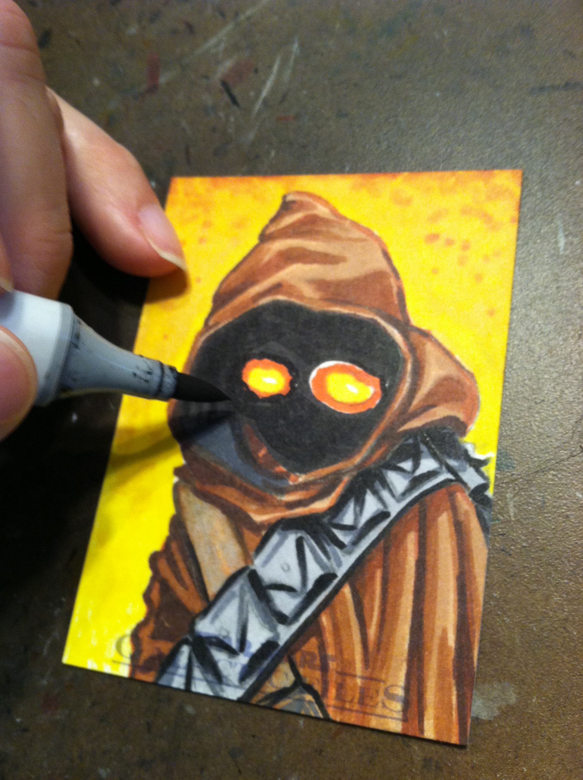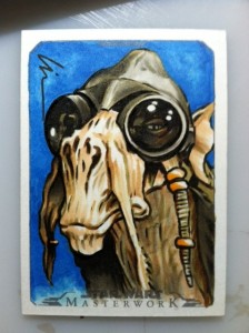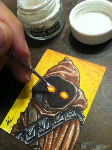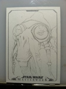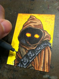 So, they apparently like to stay in the $20 and under range for sketchcards (BTW- that’s the R2-D2 mentioned above). I’ve sold some of my more quickie personal sketchcards for $20 or under, but I really can’t let official licensed sketchcards go for that little. Even if the market has become somewhat flooded, I can’t devalue them- especially ones I spent over an hour or more on and have spent hundreds of dollars on art supplies to be able to do them. Sorry, but I can’t give them away for pennies on the dollars for what goes into them. I have had sales before on my website a few times (even on my paintings), and have even given discounts for ordering more than one before (usually dropped the prices $15-25ea), but some folks have wanted me to go half price on them, and I just can’t do that. They are what they are- take ’em or leave ’em. ( Here are what a few of mine went for on eBay when they were released. I just did a quick google search and found several of my cards available for $20-100, and some for more than what I charge. You have to shop around if you want bargains.)